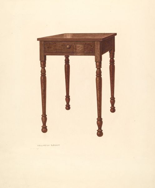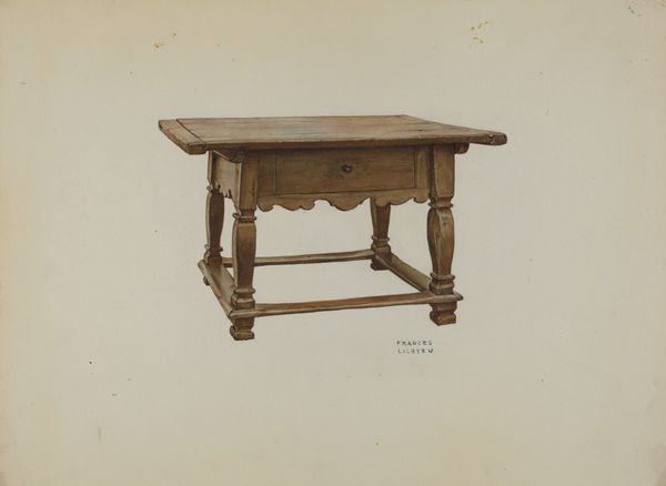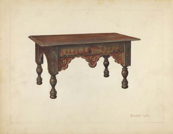Carl Strehlau made this watercolor painting of a Pa. German Table, sometime in the 20th century, using paper and paint as his primary materials. This work showcases an appreciation for vernacular design and historical craft traditions. The table itself, with its turned legs and scalloped apron, speaks to the skills of woodworkers, who typically employed hand tools. While Strehlau used watercolor, a traditional fine art medium, his choice to depict a piece of furniture elevates the everyday to the level of art. The process of rendering the table in paint invites us to consider the object’s form, texture, and the way it might have been used in a domestic setting. Ultimately, Strehlau's painting prompts us to reflect on the value we place on both handmade objects and the artistic representations of them, blurring the boundaries between art, craft, and everyday life.