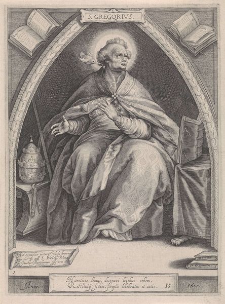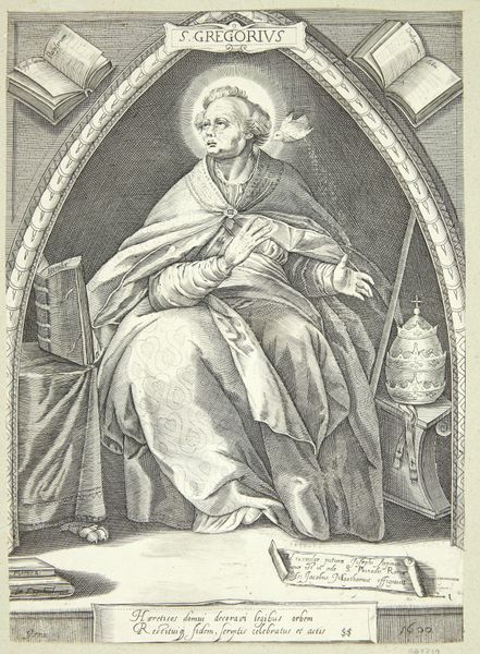 Curator: Look at the subtle yet dynamic interplay of lines that shape the form. Notice how light falls—especially that striking beam against the rough brickwork—it’s masterfully rendered and creates such a contemplative atmosphere. Editor: Indeed. What strikes me about this engraving is its depiction of the subject—this is the "Portrait of Saint John of the Cross," likely created between 1611 and 1647 by Michel van Lochom. Curator: The social and historical positioning of John of the Cross is fascinating; he was a major figure in the Catholic Reformation, and seeing him depicted here, nearly two decades after his death, provides such interesting insight. Editor: He’s rendered within a rather complex oval frame, isn’t he? The artist’s commitment to rendering texture and depth is particularly notable, especially the face and clothing. It invites us to contemplate the spiritual significance attributed to the saint. Curator: And the inscription! We can clearly see at the base that van Lochem has provided important historical context. There are clear ties to the reformation, positioning St. John within a network of religious movements and figures—the engraving acting almost like propaganda, reaffirming religious convictions in that period. Editor: It’s more than just its face value as propaganda, though, surely? I am fascinated by the use of light. The source isn't visible, and there's a tension created by it emanating from behind what looks like prison walls, casting dramatic shadows. Curator: Good point—perhaps this symbolic usage alludes to St. John's imprisonment, a challenging period in his life from which emerged his celebrated mystical writings. Editor: It definitely enriches our viewing of van Lochom's portrayal of the saint. Seeing him caught in the constraints of a rough engraving allows for a stark depiction of resilience. Curator: For me, analyzing this work provides insights into religious and political life. It exemplifies how printed imagery reinforced particular narratives and power structures. Editor: For me, it is the intrinsic interplay between line, texture, and shadow—that makes this particular engraving more than just historical artifact.