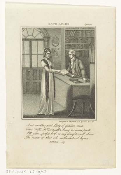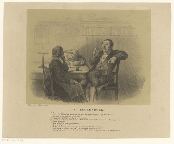 Editor: Here we have Reinier Vinkeles' "Hugo de Groot met vrouw en dochter te Loevestein, 1621", an engraving done between 1792 and 1794. The scene has a sort of quiet domestic tension... How do you read this piece? Curator: That's a great starting point. It's not just a genre scene, it's an intimate portrayal framed by power. Consider Hugo de Groot's imprisonment. He's literally trapped, but even within that confinement, we see the negotiation of power within the family. How does the posture of his wife contribute to this dynamic? Editor: She seems to be guiding the daughter, maybe protecting her or passing on some sort of message... Curator: Precisely. This is a crucial visual cue about the roles women play, both as guardians of emotional well-being, and quiet subversives. What about the books scattered around? What stories might they be telling, or hiding? What does the act of educating her child symbolize within this patriarchal structure, given that Groot was famously confined for his own writings? Editor: That’s fascinating! It completely changes how I saw the image. It is about resilience, almost rebellion, expressed through care and intellect under duress, not just domestic tranquility. Curator: Absolutely. It’s a testament to the ways in which individuals, particularly women, can carve out agency and preserve cultural values even in restrictive circumstances. Looking at the daughter between them, does she look more toward her father or mother? Editor: I hadn’t considered the image in terms of social resistance like that. Thanks! Now that you point that out, the daughter clearly looks toward the father at his desk, which underscores her parents' negotiation in those dynamics. Curator: And this can hopefully inspire further thought when examining themes of resistance in artwork!