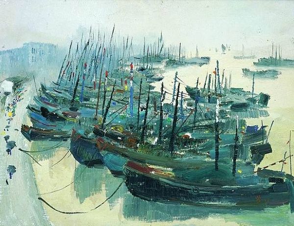 Alexander Bogen made this watercolor of Old Jaffa Port, we think in 1983, with paper and pigment, of course. Look at how Bogen teases out the colors of the scene. It's like he's coaxing the watercolor to do what he wants. You see how he lets the paint drip and pool? See the way the colors bleed into each other, all soft and dreamy? It’s like he's not trying to control everything, but instead letting the medium do its thing. Notice the way the ochre sand meets the blue of the sea. It is like a conversation between the two, with the boats as the characters. It gives the whole scene a loose, flowing feel, but the dark inky shadows under the boats anchors them, giving a sense of gravity and place. Bogen's approach reminds me of other painters like Emil Nolde, who really knew how to make watercolor sing. I find something new every time I look at it. It's like Bogen is inviting us to slow down, to wander, and to wonder.