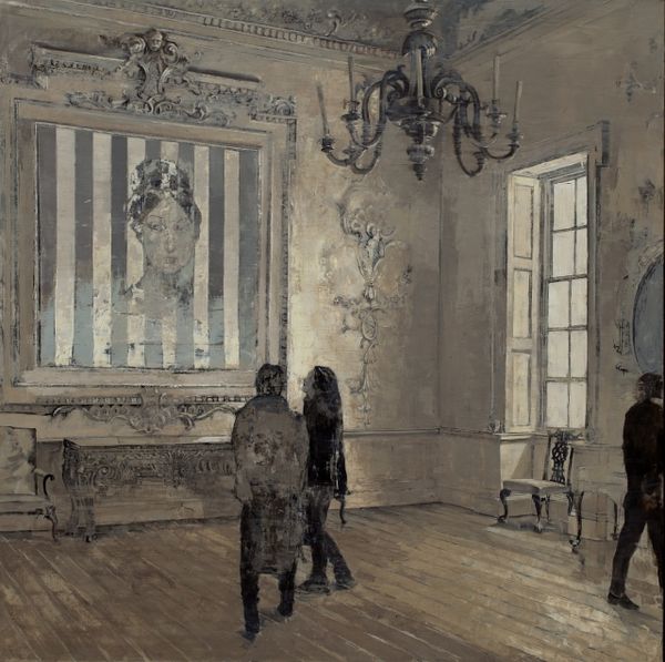 Curator: "Gathering," painted by Nick Alm in 2018, presents us with a group of figures rendered in oil paint, bathed in soft, diffuse light. Editor: The immediate feeling I get is one of subdued tension. The muted color palette, primarily grays and blacks, gives the scene a somber, almost claustrophobic atmosphere despite the implied grandeur suggested by the chandelier. Curator: That's a keen observation. Alm’s work often treads the line between classical figuration and contemporary realism. In the context of 21st-century art, the realism reminds the viewer of history. Alm pulls from genre-painting styles and group portraits which, historically, depict nobility and civic structure. Editor: The figures are indeed posed like a gathering of some sort but something feels incomplete in the narrative being portrayed. Everyone's facing different directions, seemingly absorbed in their own thoughts. The woman in the foreground looks directly at the viewer, and draws us directly into the psychology of the scene and that, for me, hints at something very deliberate, and perhaps melancholic. I detect symbolic associations with traditional themes like loss, mourning, or even societal unease. Curator: Symbolically, beyond that specific individual’s stare, the room itself is incredibly fascinating. The opulence of the chandelier contrasts with what appears to be more meager food settings, speaking to the social contrasts in our own moment and the gatherings we have at formal settings like the painting seems to indicate. It's an interesting commentary. Editor: It certainly makes you ponder what sort of gathering this is, and whether it's celebratory or something more somber. And look how strategically Alm’s arrangement calls on archetypes like those you’d see in Rembrandt and Caravaggio. He uses light to separate the groups, in turn separating the meanings we might create based on who is illuminated or hidden in shadow. Curator: Precisely. This painting engages in a wider discourse on contemporary life, using visual allegories reminiscent of past masters, which also connects us to what those styles might represent—old wealth or generational dynamics. Editor: Overall, a beautifully executed painting that prompts us to reflect on communal bonds and unspoken sentiments. The title alone – “Gathering” – speaks volumes, a deceptively simple word concealing complex emotional depths. Curator: And through this, Nick Alm gives a powerful lens into our current cultural dynamics by using techniques from generations past. It encourages you to consider art history when in social situations of your own!