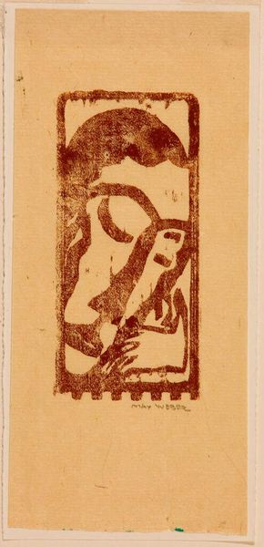Curator: Well, here we are in front of Max Weber's "Seated Woman," a woodcut print made between 1919 and 1920. What strikes you about it at first glance? Editor: It feels… elemental. Reduced. Stripped back to the very bones of form and feeling, like a memory half-recalled in a dream. Curator: Weber really pushes the expressive qualities of the woodcut, doesn’t he? Notice how the stark contrasts create such a graphic impact. It’s intriguing how he uses the materiality of the medium to heighten the sense of primitive strength. I'm thinking about how a print can be both a unique artwork but also infinitely repeatable, so thinking about class, consumption, labor that goes into both... Editor: Absolutely, and the grain of the wood becomes so much more than just a surface; it’s intrinsic to the artwork's character. You can almost feel the artist's hand carving away, leaving only what is essential. Curator: Right, and this piece is particularly fascinating because it marries figuration with elements of abstraction, reflecting Weber’s interest in avant-garde movements and a yearning for spiritual truth during a time of immense social change after World War I. I wonder what was in his workshop; what was available and inspiring his choices to make this? Editor: You can see how Expressionism influences his reduction of form into emotional symbols. It is as if, in the wreckage of modernity, these stark prints were attempts to uncover core meanings from the very substance of art-making. Even today, I think we want to recover the directness and unpretentiousness of such media. Curator: Agreed. It serves as a powerful reminder that art can distill the human experience into its most fundamental, resonant form. Editor: Indeed, leaving us to consider how, with only a few lines carved into wood, Weber captured something so profoundly human and enduring.