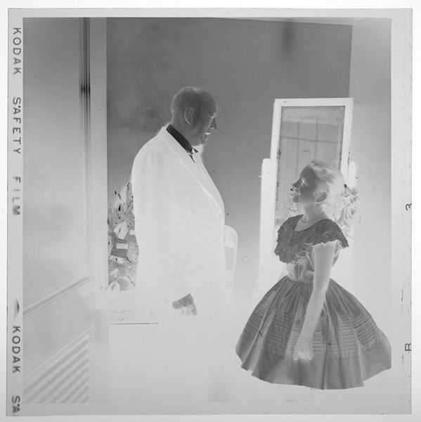Curator: Here we have an untitled photograph by Jack Gould, showing a girl in a dress and a man in a suit. Editor: It has a strangely unsettling mood, like a half-remembered dream. Curator: The mirror reflecting the girl emphasizes a duality, perhaps innocence juxtaposed with societal expectations. Her dress signifies a performance, a role she's being asked to play. Editor: Considering this is a photographic negative, the process itself invites us to think about how representation and reality are inversions of one another. Also, what is the man holding? Curator: The photograph makes me think of the cultural symbolism of fathers and daughters at that time. What message are we meant to see, I wonder? Editor: For me, it's more about the raw material, the film itself, and the labor involved in creating this image. It reveals so much even in its simplicity. Curator: Indeed. It leaves a lot open to interpretation, which makes it fascinating. Editor: Absolutely, and for me, it is a question of the physical artifact, its making, and its survival.
