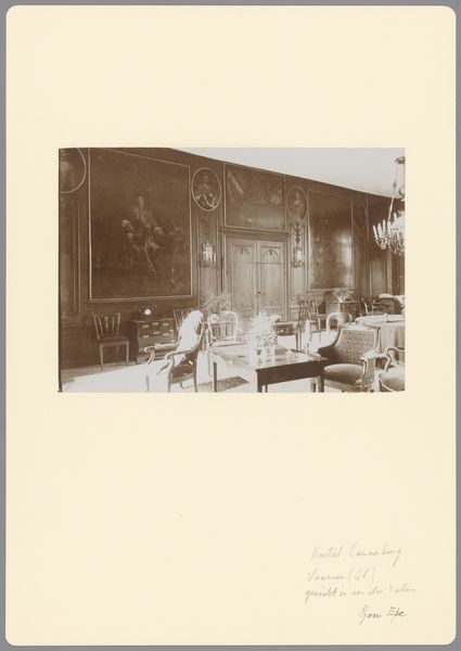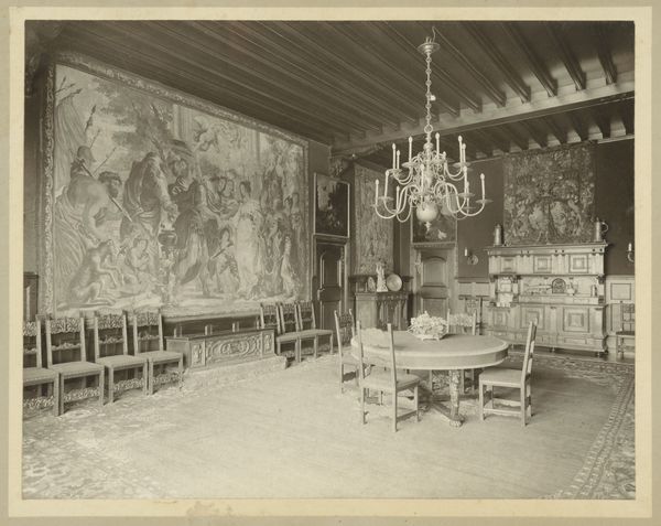Curator: This gelatin-silver print, titled "Gezicht op de voormalige vergaderzaal van de Provinciale Staten in de Abdij van Middelburg", was created circa 1900 by the Gebroeders van Straaten. What are your initial thoughts? Editor: My first impression is how incredibly staged it feels. There’s a rigid formality to the composition; the chairs are all perfectly aligned, and everything is meticulously arranged, lacking a certain vitality. Curator: I see what you mean. The staging is significant, highlighting the intended purpose and authority of this space. Think of gelatin-silver printing; this photographic process offered incredible detail, emphasizing the materiality of power – the wood of the furniture, the fabric of the wall hangings. These are deliberate choices designed to showcase not just the room but what the room represents. Editor: Yes, and if you look at the wall tapestry, it’s such a strange inclusion, stylistically clashing with the functional sobriety of the rest of the room. One almost has to wonder if this piece of decor has more historical relevance or not. The choice to display imagery depicting boats also creates questions, I am sure. Curator: Precisely! The tapestry likely represents Middelburg’s maritime history and its role in global trade and governance. The Gebroeders van Straaten have carefully composed the shot, including a visual narrative that subtly reinforces the history and global influence associated with those seated in the room, which creates an element of both direct social and historical context. Editor: I wonder what purpose this image ultimately served. Was it intended to document, or perhaps as part of a wider political narrative for propaganda. In any case, considering that photographic printing existed at this moment and allowed them to emphasize detail so incredibly, I have to give this picture to Gebroeders van Straaten, for emphasizing those material processes. Curator: It’s also about visibility, right? The production of prints like these allowed for widespread distribution, cementing the importance and status of the Provinciale Staten. Think about how photography in the late 19th century began playing a crucial role in constructing collective memory. Editor: It all comes together, doesn't it? The artistry of the photographic process underscores the weight of this former meeting room's place within the history of Dutch politics. The tapestry emphasizes the influence this institution used to have in maritime and overseas endeavors. And, in that moment we can still consider the relationship between the work, its processes, and ultimately its history. Curator: Agreed, and this careful photographic creation serves as a document, solidifying that space as both place and an idea within a grander historical perspective.