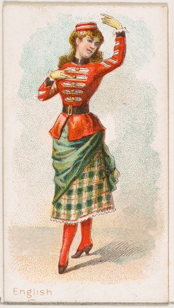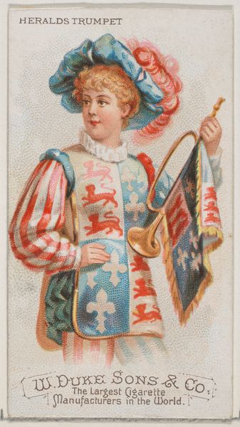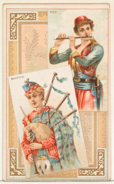 Curator: This delightful little print comes from a series titled "Musical Instruments," produced in 1888 by W. Duke, Sons & Co. as promotional cards for their cigarettes. The artwork we're examining today showcases a young woman playing the bagpipes. Editor: It’s incredibly charming, if a little odd. The rendering feels both precise and somehow…stiff. The colors are bright, almost pastel-like, which is surprising. Is it a drawing? Curator: It is a coloured-pencil drawing reproduced as a print. Think about the immense scale of tobacco production at this time—Duke claimed to be the largest cigarette manufacturer in the world. These cards were essentially mass-produced multiples. The means of producing this imagery, through industrial printing and its connection to a global commodity, feels particularly pertinent here. Editor: Absolutely. And placing it in the context of late 19th-century marketing sheds light on the exoticization at play. The bagpipes and kilt suggest a romantic, somewhat stereotypical view of Scotland. It also feels subtly aligned with the period’s fascination with Orientalism. This isn't just about selling cigarettes, is it? It's selling a particular vision of culture. Curator: Precisely! The very act of collecting these cards and circulating them participates in creating cultural understanding or misunderstanding. The way people interact with images has significant socio-political effects. What do you make of the composition? Editor: There’s something a bit awkward about it. She’s clearly meant to be the central figure, but the bagpipes themselves almost overpower her. Also the coloring, on second viewing, flattens her a bit as if she has just been cutout. The attempt at realism feels… well, manufactured, doesn’t it? Curator: And yet that manufactured quality is what’s interesting. It highlights the way identities are constructed and commodified. It allows us to think about how global capitalism and its representation through these little art cards plays a huge role in our world. Editor: I concur. It gives one pause to realize such an everyday item once functioned as a medium of cultural transmission and subtle marketing propaganda. It highlights just how complex visual imagery in society is.