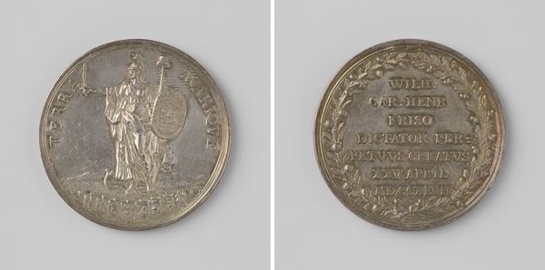 Curator: Looking at this piece, I'm immediately struck by how contained everything is, yet the symbolism seems to overflow those boundaries. Editor: We’re looking at a bronze medal crafted in 1851 by David van der Kellen. The medal commemorates the 50th anniversary of the Genootschap voor Natuurkundige Wetenschappen te Groningen – that's the Society for Physical Sciences in Groningen – founded by Theodoor van Swinderen. You can find this little treasure at the Rijksmuseum. Curator: The society, of course, being devoted to the physical sciences! It's an academic celebration, then? So formal, but my eye keeps landing on that pelican—totally unexpected. I love the kind of whimsical imagery sitting along side what seems like really serious…scientific equipment. Editor: That pelican—in medieval bestiaries, the pelican was believed to wound itself to feed its young with its own blood—became a symbol of self-sacrifice and nurturing, and it frequently alludes to charity. The positioning here connects nurturing to the progress of scientific pursuit. Curator: That connection almost transforms the objects—the instruments, the globe—into sacred tools. I'm also curious, though, if there might be an echo of that more visceral reading of self-sacrifice, of dedicating your whole life, maybe to a field or study, to your own work? The kind of giving that can almost draw blood! Editor: Fascinating thought! Then the other allegorical figure becomes even more pointed. The society sought the advancement of the natural sciences—what a symbolic narrative to inscribe into cultural memory. Here it reminds us to think about our cultural memory as part of science and progress, not distinct. Curator: Looking closer at it now, the bronze has such incredible depth for something relatively small. You could easily walk past this case in the museum, I think. It almost demands a quieter kind of contemplation—which is exactly what scientific discovery takes! Editor: Right, but in bronze, a statement of permanence—these are the ideas and ideals to preserve. A society dedicated to learning—there are worse things to be written into bronze.