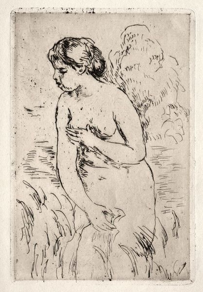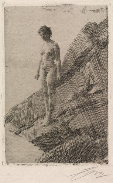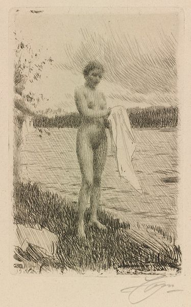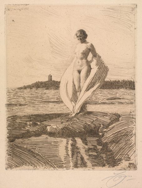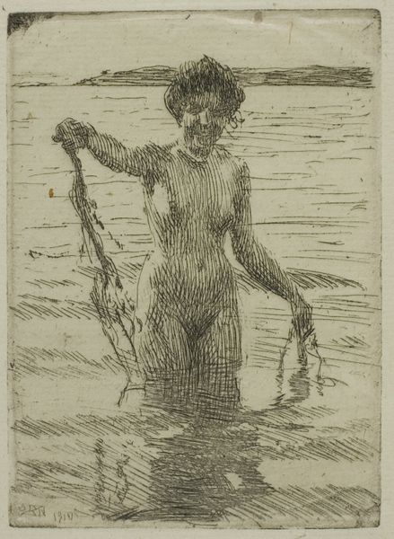Curator: Anders Zorn's 1907 etching, "Circles of Water II", presents a fascinating interplay of figure and landscape. Editor: It's surprisingly delicate for an etching. The soft, diffuse light gives it a rather ethereal, almost dreamlike quality. The figure, partially submerged, is nicely integrated into the scene. Curator: Zorn was a master of capturing light and movement, and this print certainly reflects that. He achieved international acclaim during his time for his contributions to impressionism. The popularity of the nude, as a celebrated theme, rose to the fore within academic and artistic circles in the early 20th century. Editor: Notice the economy of line; the reflections in the water are rendered with incredible efficiency. You can really see his skill in capturing a sense of depth and surface texture using just the etching technique. Curator: Zorn’s prints often explored themes of leisure and the natural world. One wonders how contemporary viewers would have perceived his celebration of the female nude in this seemingly idyllic setting, particularly when questions of social norms around representation were being more loudly questioned. Editor: Yes, context is important, but structurally, it is more interesting to observe how the figure and landscape converge to evoke sensory experience through simple methods. Curator: This work offers insight into the evolving cultural norms of the era and prevailing artistic tastes, though. It reflects, to some extent, how art played a part in shaping and reshaping collective perceptions. Editor: Regardless of social context, one has to recognize the artistic craft, in terms of texture, tonal modulation and elegant rendering. Zorn really distilled a sense of a fleeting moment there. Curator: Agreed. Ultimately, Zorn’s technical skills cannot be overlooked in appreciating its historical context. It serves as a window into artistic ambition within social discourse. Editor: It does, leaving us to contemplate Zorn’s beautiful convergence of light, water, and the human form through visual harmony.