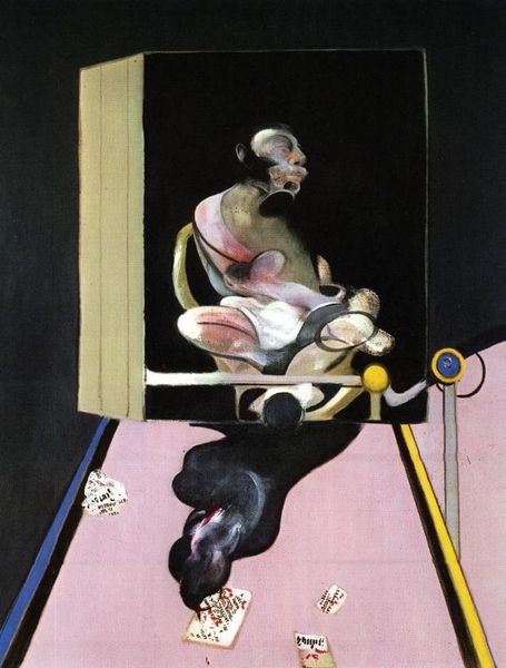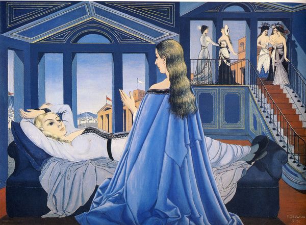 Editor: Here we have Paul Delvaux's "Femme a la Rose," created in 1936 using oil paint. I find the painting quite unsettling with its almost theatrical atmosphere. What do you make of this piece? Curator: From a materialist perspective, consider the oil paint itself. Delvaux meticulously layers it to create a sense of hyper-reality, an uncanny space between dream and waking life. The very means of production—the painstaking application of pigment—underscores the constructed nature of this reality, a reality far removed from lived experience for most people. Think about the availability and cost of materials at the time. Who could afford paintings like this, and what does it say about social hierarchies? Editor: So, it’s not just the imagery, but the materials themselves that speak to societal structures? Curator: Exactly. The smooth, almost porcelain finish of the figures, achieved through careful blending, further emphasizes a sense of idealized femininity and the commodification of beauty. How does this process of idealization, enabled by the materials, connect to contemporary forms of image production and consumption? Editor: That makes me consider the fabric of the woman's dress and how deliberately that's rendered, almost fetishized. And how labor intensive it would be to paint the dress's folds in that kind of detail... Curator: Precisely! That labor is key. Also, ponder the rose, wilting on the floor. Is it simply a symbol, or also a comment on the life cycle of commodities within a capitalist system, beautiful, desired, then discarded? Editor: I hadn’t thought of the rose in that way. I see how the material choices really embed the painting within its historical context. Curator: By focusing on the material and processes behind "Femme a la Rose," we've unearthed new perspectives on its relationship to labour, consumption and social hierarchies. Editor: Thank you. I learned that analyzing the medium is as important as considering the image's content.