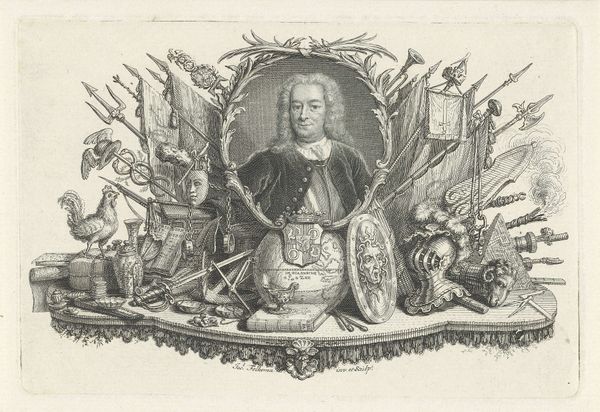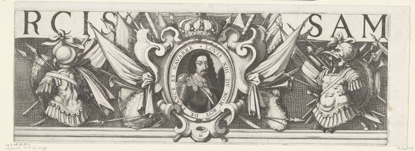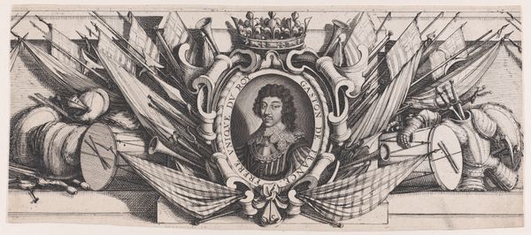 Editor: This print, "Siege of La Rochelle, September 1627-October 1628," by Michel Lasne, made between 1628 and 1631, seems overwhelmingly about power. So much weaponry surrounding this royal portrait...it's quite intense! What strikes you most when you look at this, Professor? Curator: It whispers to me of theatre, that heightened drama so beloved by the Baroque. All those meticulously rendered flags and instruments of war act as stage dressing, don’t they? It is designed to proclaim victory but seems caught in the ambiguity of history; notice how it is just a segment of the border! Perhaps a piece in a story larger than our field of vision allows? Editor: I hadn't thought of it that way – almost a snapshot, versus the whole scene. So, is Lasne suggesting there's more to this siege than just one triumphant image? Curator: Precisely! Perhaps Lasne means to hint at the longer and wider implications. Take that central portrait, crowned and encircled: who is that figure, really? Is that an honest portrayal, or one designed to evoke loyalty, respect, or even fear? Those eyes following us around the room--doesn't that add a delicious layer of theatricality? Editor: That makes me think about how carefully staged these kinds of images would need to be, and how, depending on who it was for, the details might change quite a bit. Curator: Exactly! It begs us to ask ourselves, ‘What are we *not* seeing? Whose perspective is absent here?' It is what floats just beyond the visual surface where, I think, much of the piece’s resonance resides. The artist teases us toward a far richer tableau… Editor: It feels so much richer, understanding the nuances. Thanks for sharing your insight! Curator: A pleasure! Remember to question everything--and always look beyond what is readily seen.