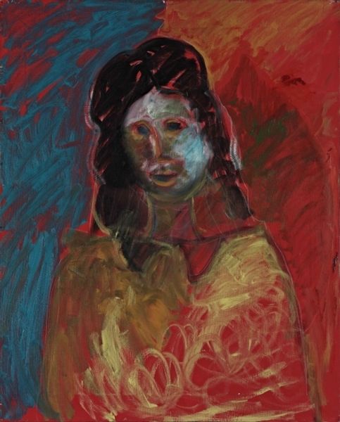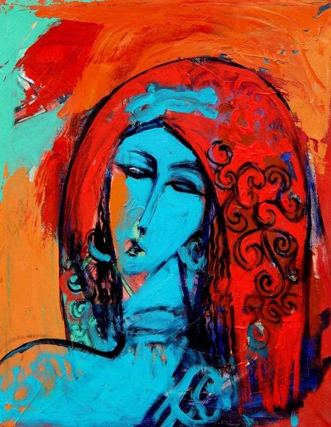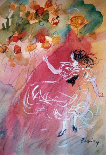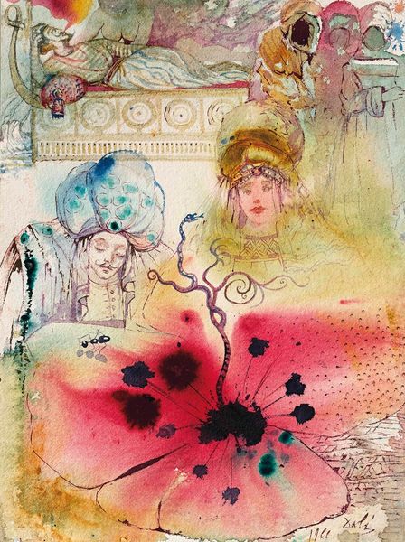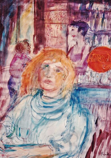 Editor: This is "Spring" by Maria Bozoky, done in watercolor. There isn’t a date associated with it. I find the face very delicate against the bursts of color, but those scribbled lines are a bit distracting to me. What are your thoughts? How do you interpret this work from a purely visual standpoint? Curator: The artist has masterfully employed a limited palette to create a sense of ethereal beauty. Note how the soft washes of color build form and suggest depth, yet the piece maintains a captivating flatness. Do you observe how the eyes serve as the focal point, achieved through a contrasting intensity of color? Editor: I do, the blue really pulls you in. But what about those lines, they seem so out of place. Curator: Those lines are not extraneous but integral. They create a dynamic tension, disrupting the romanticism we observe. These lines, thin and deliberate, delineate the edges of the composition, anchoring the looser washes of color and giving structure to what could easily become amorphous. We could view the watercolor's transparency juxtaposed with stark linework. A way to deconstruct romantic ideals perhaps? Editor: That makes sense, like there's a push and pull between softness and structure, romantic and… real? So it is not purely representational? Curator: Precisely. While figuration is present, it operates within a sophisticated dialogue of formal elements, calling into question our conventional notions of beauty and representation in portraiture. Consider how Bozoky compels us to focus on her painting’s internal mechanics, color choices, technique, and application of specific shapes. Editor: I see, focusing on what the artist _did_, instead of what she depicted. Thanks, I’m understanding it in a completely different way now. Curator: And I find renewed appreciation considering your insights. These artistic conversations bring fresh ways of considering a painting!