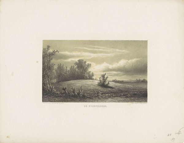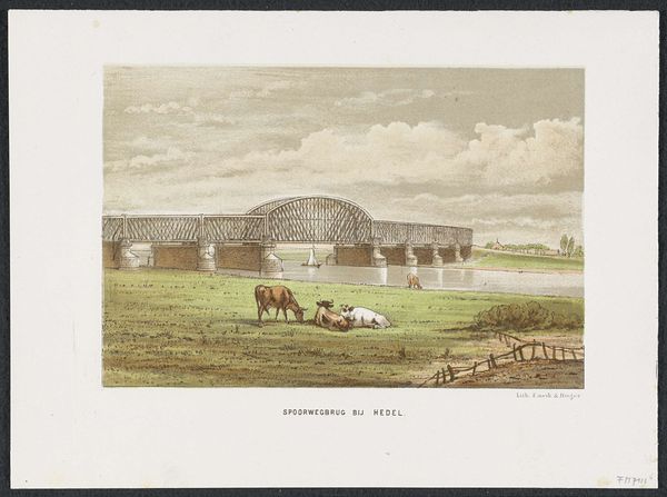 Curator: Look at this— "Waalbrug bij Zaltbommel, 1869," or Waal Bridge at Zaltbommel from 1872-1874. This print is an etching and showcases a beautiful landscape by an anonymous artist. It’s currently held here at the Rijksmuseum. What's your initial reaction? Editor: Serene. I mean, it’s clearly representational, a rather direct depiction. The muted tones, the way the bridge bisects the horizon, it all creates a very calming effect. It reminds me of quiet afternoons spent by the riverbank as a child. Curator: I agree completely, and I feel that speaks to the strength of its realism and its genre-painting touches. I love how the artist included those resting cows. They look so peaceful. It gives a little slice-of-life intimacy that offsets the scale of the industrial bridge and emphasizes the gentle, everyday rhythms alongside technological progress. Editor: Interesting, I'm also drawn to that bridge itself. The way it's meticulously rendered really commands attention. Notice the structure and the light that plays on it, too. It contrasts rather dramatically with the pastoral foreground; I read that opposition as a clever formal device. It highlights a moment of change within the dutch landscape as modernization begins to creep into its idyllic sceneries. Curator: That interplay between the man-made and the natural is pretty compelling. There's an interesting tension; perhaps a gentle melancholy even—or at least a recognition of transition. It almost feels prophetic with a gentle nod towards industry. Editor: I do wonder about the choice to use an etching, versus painting, for example. What do you think? The precision and delicate line work almost mirrors the engineered structure, but it's a softer, more nostalgic touch compared to, say, a sharp photographic approach. The texture in the sky is beautifully achieved! Curator: That's a good point, you know. Etching brings a softness—a bit of timelessness even—that smooths the jolt between pastoral life and modernity that the artist portrays. Thank you for pointing this out! I hadn't thought of it in quite that way. Editor: Well, it's a compelling composition to discuss. The contrast really enhances the nuances and creates a beautiful landscape.