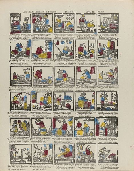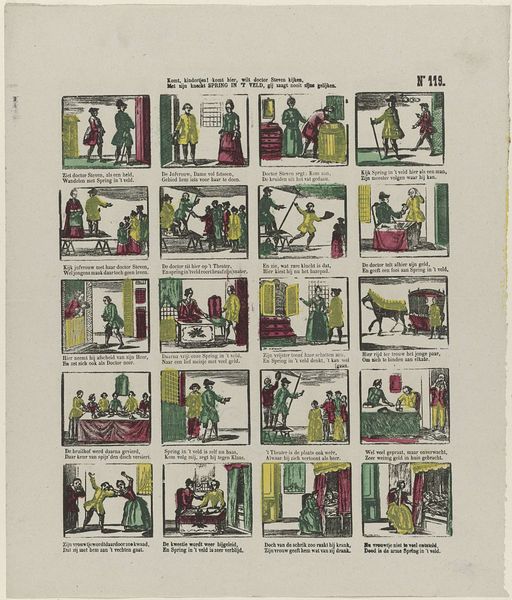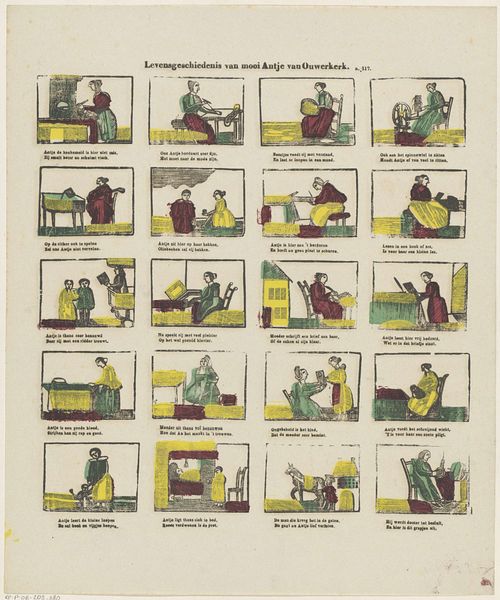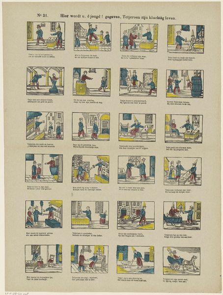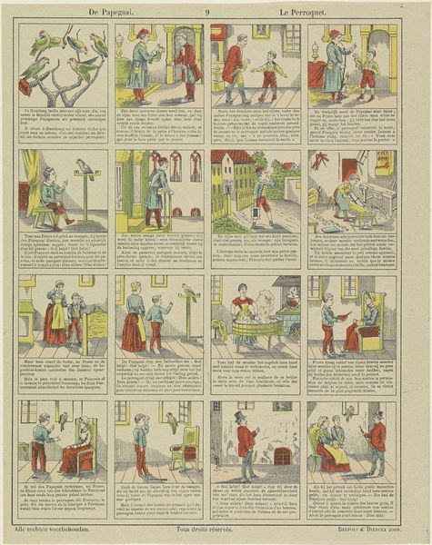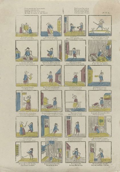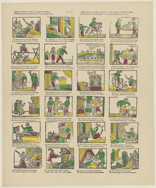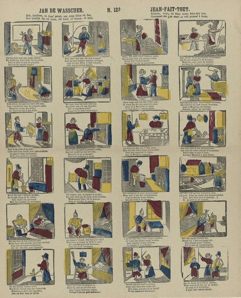 Editor: Here we have "De Amsterdamsche kermis vreugd" from Glenisson & Zonen, dating somewhere between 1856 and 1900. It's a print, seemingly depicting scenes from a fair. What immediately strikes me is the compartmentalized composition. How do you approach a piece like this? Curator: From a formalist perspective, the piece presents a fascinating interplay between text and image. Consider the grid structure, where each frame functions almost as a miniature stage. The limited color palette – primarily red, blue, and yellow – emphasizes the linearity and graphic nature of the work, reducing forms to their essential shapes. Editor: So, it’s the formal structure that carries the most meaning for you? Curator: Precisely. Observe how the artist uses repetition – in the figures, their clothing, and the architectural elements – to create rhythm and visual unity across the disparate scenes. Even the typeface and its placement contribute to this overall structure, acting as another visual element within the grid. Notice too, the flattening of space within each scene. Does this choice, coupled with the limited color range, tell us something about the artist’s intentions? Editor: I see what you mean about the repetition creating unity. And yes, flattening the image plane removes any sense of realism or deep perspective. So, are you saying the narrative itself becomes less important than how it's presented? Curator: I would posit that the ‘what’ is subservient to the ‘how’. The emphasis is on the aesthetic relationships established within the artwork, the interplay of line, color, and form. The fair is secondary to how it's rendered. Editor: That’s a perspective I hadn’t considered before. Focusing on the arrangement of elements rather than the subject itself...fascinating. Thanks for that breakdown! Curator: It underscores how critical engagement with art necessitates an appreciation of the artistic method, of the work itself as the primary source of significance.