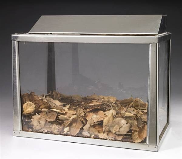 Allen Ruppersberg made this vitrine, Al's Grand Hotel, to contain traces of an artmaking process. The muted palette and found materials make it a melancholic piece. I’m struck by the way Ruppersberg assembles seemingly disparate elements. The newspaper, the tube of paint, the clear case: it is like a fossil in which the object tells us about a moment in time. This moment is then placed in the gallery, displayed under glass, transforming the residue of an artist's process into an object of aesthetic contemplation. The silver frame adds to the work's sense of preciousness. We think about the contrast between the disposable nature of a newspaper and the supposed permanence of art. This piece shares an affinity with the work of Joseph Cornell, who created intricate worlds within boxes. Ruppersberg's piece also invites a quiet, personal reflection, opening a space of imagination around the artwork.