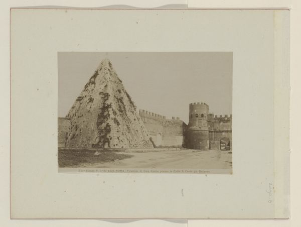 Curator: Joseph-Philibert Girault de Prangey’s "Porte de la Citadelle, au Kaire," dating to 1843, is a captivating early photographic print capturing a majestic cityscape. Editor: The initial impression is one of sheer monumental presence. The scale feels deliberately emphasized, almost romanticized through the stark contrast and geometric simplicity. Curator: Indeed. Girault de Prangey focuses intensely on architectural details, from the striped masonry to the archway, giving the citadel's entrance a weighty, permanent feel. He uses the new medium of photography to convey the literal stoniness and texture like never before. Editor: But it’s more than just a document, isn’t it? Consider the symbolism inherent in a citadel gate – a threshold, protection, power. The very act of photographing this suggests a European gaze upon a land viewed as simultaneously ancient and potent. It invokes notions of orientalism through a Western lens. Curator: Certainly. The artist meticulously captures the textural complexity within its aesthetic and political context. Note the gradation of light and shadow against the building's surface, effectively using tonality as structure. And there are subtle human elements included which ground this composition with a sense of life and time. Editor: Exactly, it reminds us that places such as this exist with human stories within their walls – that this gate has both real structural weight, as you say, and cultural weight as a stage for those stories. Curator: This photograph encapsulates both literal structure and imposed cultural interpretation, revealing a convergence of observation, artistic technique, and encoded symbolism. Editor: A lasting example of how buildings stand both for their basic structures and the beliefs visitors pour into their silent stones.