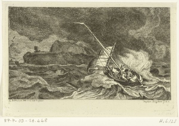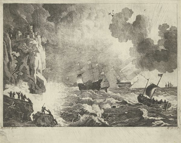 Editor: Here we have Matthieu van Plattenberg’s etching, “Schipbreuk,” created sometime between 1617 and 1660. It depicts a tumultuous shipwreck, and the scene feels incredibly chaotic and almost biblical in its intensity. What strikes you most when you look at this piece? Curator: The symbol of the ship, especially one wrecked against the rocks, has long been a potent image, hasn’t it? It represents not just physical danger, but also the fragility of human endeavor against the overwhelming forces of nature, fate, or even divine wrath. Do you see how the jagged rocks echo the broken masts? It's a visual language of disaster, quite consciously deployed. Editor: That makes sense. I hadn't really thought about how the composition reinforces that feeling. Curator: Beyond the immediate drama, consider what the "ship" might stand for, culturally. In the 17th century, maritime trade was booming. For the Dutch Republic especially, ships *were* prosperity and power. So a shipwreck carries further resonance; perhaps something about the limits of ambition, or the precariousness of earthly fortunes? Even that sudden beam of light in the corner - is it hope, divine intervention, or simply cold, indifferent illumination of a catastrophe? Editor: So it’s not just a picture of a shipwreck, it's also commenting on larger societal themes. I will definitely need to spend more time interpreting the meaning of symbols! Curator: Indeed! It is a powerful skill which gets better over time and repetition. Editor: Thanks so much, this really opened my eyes to new ways of reading art. Curator: My pleasure. Symbolism adds an extra dimension of understanding to an artwork, a real layer of complexity to unpack.
