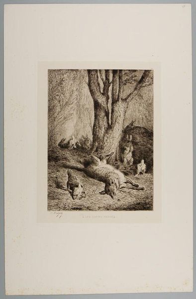 Curator: Here we have "The Death of Saint Jerome" by Étienne de Lavallée-Poussin. Editor: It's a strikingly somber scene. The cave setting seems almost oppressive, yet there's a dynamic energy in the swirling lines. Curator: Poussin, active during the 18th century, often engaged with historical and religious themes. The print medium itself allowed for wider dissemination of such imagery. Editor: The etching technique really emphasizes the materiality. The rough, textured rock face contrasts with the smoother, almost ethereal rendering of the angels. It speaks to earthly suffering versus divine intervention. How were such prints received? Curator: Prints like these democratized art. They brought religious narratives into homes, shaping popular piety and moral values in a rapidly changing society. Editor: It’s fascinating how the production and distribution of this small print could influence wider social and religious ideologies. It makes you wonder about the labor involved. Curator: A potent reminder that art is never created in a vacuum, but rather reflects—and shapes—the world around it. Editor: Indeed. A small object, but brimming with questions about faith, labor, and the artistic process itself.