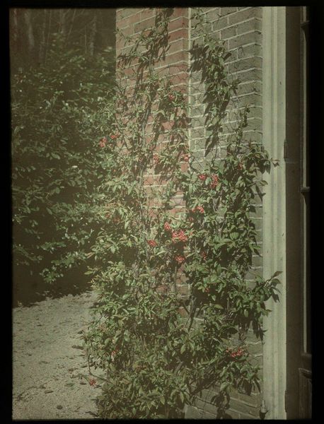 Editor: Here we have a photo, "Klimplant tegen de muur van een huis (detail)," or "Creeper on the Wall of a House," taken sometime between 1907 and 1930, authorship is unclear but found in the collections of the Rijksmuseum. It is very serene in its soft focus and colour palette. It looks very 'Impressionistic' to me, reminiscent of paintings from that period. What strikes you most when you look at this work? Curator: The creeper isn't just clinging; it's dancing with the brick, a duet of nature and structure. It's as if the plant, weary of reaching for the sky alone, decided to partner with something solid, something permanent. Do you see how the bricks offer this rigid grid, grounding what would otherwise be untamed nature? Editor: Absolutely, and the light playing on the wall adds to the dreamlike quality. Curator: Exactly! Think about the walls in our lives. Physical and emotional. What kind of creeper, what kind of beauty are we allowing, or even encouraging, to grow on them? And are we brave enough to let the blooms cast shadows that might momentarily obscure the "perfect" lines we’ve drawn for ourselves? Editor: That’s a lovely way to look at it – almost philosophical! It’s made me reconsider how I perceive these small, natural details we often overlook. Curator: Agreed, this piece, far from being "just" a creeper on a wall, it’s a gentle nudge towards embracing the beautiful imperfections and unexpected symbioses that make life, and art, worthwhile.