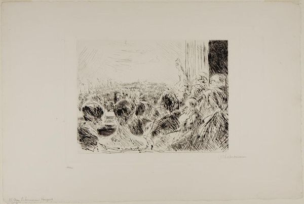 Curator: Here we have Lovis Corinth's "Spring with Appleblossoms," currently residing in the Harvard Art Museums. Editor: It’s remarkably delicate, almost fleeting. The spidery lines seem to capture the very essence of spring's ephemerality. Curator: Corinth, known for his later, more robust paintings, shows a lighter touch here. The etching process itself lends to this delicacy, allowing for fine lines and subtle gradations. Editor: Absolutely. The way the copper plate is etched and inked, it becomes a printing matrix, a tool for mass production, yet each print retains a unique character. It democratizes art, bringing landscapes to the masses. Curator: It's interesting how the lack of strong tonal contrast pushes the viewer to actively engage with the composition. The socio-political message here is one of accessibility and finding beauty in the everyday. Editor: The lines, the labor… they speak of a deliberate act of creation, transforming base materials into something beautiful, something that hints at a world in bloom. Curator: It certainly provides food for thought on the artist's process and its intended audience. Editor: Agreed. The material and the message are intertwined here.