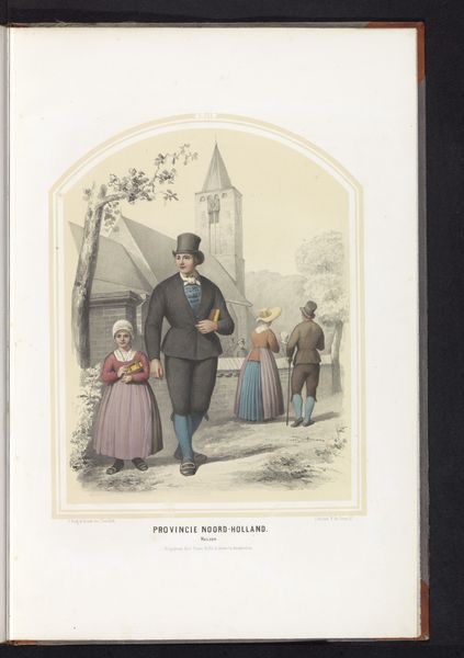 Ruurt de Vries created this print, "Klederdracht van Bunschoten in Utrecht", in 1857. The composition arranges figures and landscape in a soft, rounded tableau, encased within a simple, arched frame. The muted palette and gentle gradations of tone give the scene a tranquil, almost nostalgic quality. De Vries uses the semiotics of clothing to define social roles. The man's formal attire signals a particular status, which is contrasted with the more functional clothing of the woman beside him, and those working in the field in the background. This semiotic system extends to the landscape, where cultivated fields denote order and productivity. The image's structure—its carefully balanced composition and subtle color harmonies—creates a sense of idealized rural life. Through this formal arrangement, de Vries invites viewers to consider the values and structures that underpin this representation of Dutch society. The work ultimately encourages a deeper reflection on how cultural identities are constructed and communicated through art.