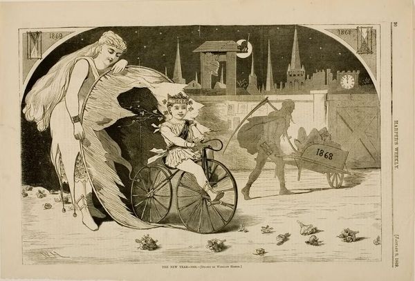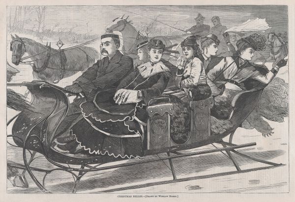 Curator: This is "Christmas Belles," designed by Winslow Homer and published in Harper's Weekly. Editor: Oh, it’s a real winter whirl, isn't it? All that bustling energy—the horses practically flying. Curator: Indeed. As a popular print, it offered a glimpse into upper-middle-class leisure, where a sleigh ride became a spectacle of social display. Notice how the women's fashion emphasizes status. Editor: They look a tad uncomfortable though, all bundled up and perched on that chilly seat. It’s funny, the image promises carefree joy, but I see a lot of restraint, almost performance. Curator: That tension might stem from the era's rigid social codes, governing public behavior. Homer captures this with a keen eye, hinting at the performative aspects of leisure. Editor: So, more than just a pretty picture, it's a little societal stage? Makes you wonder what they're really thinking beneath those bonnets. Curator: Precisely. The artwork serves as a time capsule, revealing both the joys and the constraints of a particular social class during that period. Editor: It's like a beautifully rendered, slightly unsettling, snapshot of a bygone winter. I like it.