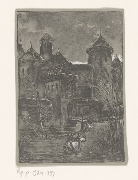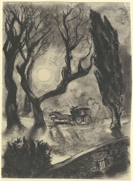 Curator: Ernst Lincker rendered this vista "Near Clarens on Lake Geneva" in charcoal on paper around 1924. It resides here at the Städel Museum. Editor: There's something undeniably eerie about this landscape, isn't there? The darkness is punctuated by that intensely bright water, creating this high contrast that pulls you in but also makes you a bit uneasy. Curator: That tension seems appropriate for Lincker's work. As a proponent of Neo-Romanticism, he rejected the industrial and embraced depictions filled with subjective emotional experience, often tinged with anxiety, harkening back to the Romantics after the devastation of World War I. Editor: Yes, there is a sense of returning to the past. It seems very elemental with that powerful natural force of the water contrasting the solid construction of the building. You also get a sense of human versus nature. In terms of symbolic weight, flowing water often signifies time and change. Does the architectural permanence here represent a resistance to change, a futile attempt to hold on? Curator: Perhaps. Post-war, many artists, especially in Germany, wrestled with that desire to return to a more stable past while simultaneously acknowledging the irrevocability of their changed present. This piece, although seemingly simple, speaks to the complex psychological landscape of that era. Lincker later ended up a professor and, sadly, had his work condemned by the Nazi regime, another marker of that tumultuous epoch. Editor: Knowing that just makes the image all the more potent. The isolated structure almost seems like a fortress under siege by both natural forces and historical pressures. The tree trunk on the side acts as a frame, giving it an almost theatrical aspect like we're peeking in on a staged drama, doesn't it? Curator: Precisely! It's as if Lincker is presenting us with a stage upon which the drama of memory, loss, and resilience unfolds. The selective brightness illuminating that building seems like he's highlighting that human struggle against the tide of larger societal upheaval. Editor: It definitely stays with you, and brings out many emotions and associations as you look more and more carefully. I now know the name of Neo-romanticism rings true, with that almost gothic mood. Curator: Absolutely. It offers a powerful insight into that very specific moment in the 20th century.