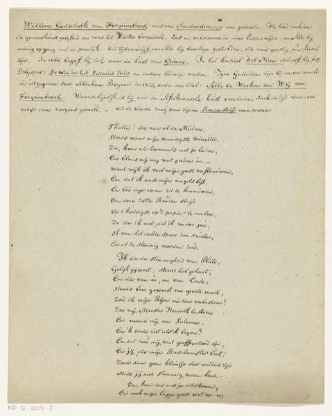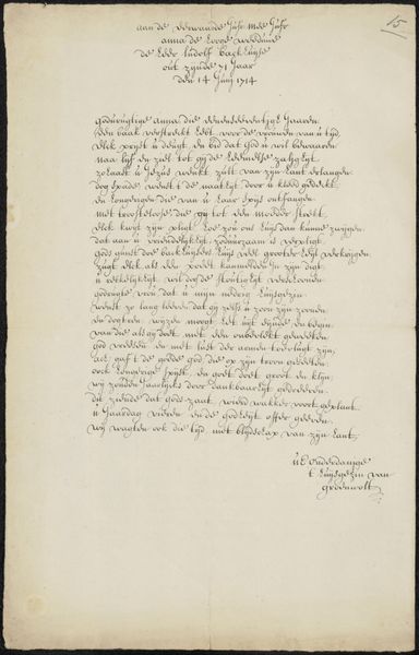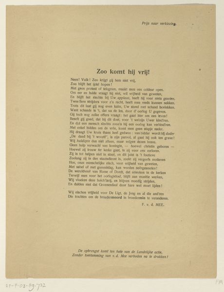 Curator: Here we have a striking broadside print titled "Vers bij de spotprent op Napoleon" created anonymously in 1813. It's quite rare; we have it here at the Rijksmuseum. Editor: My first impression? Stark. Visually, it feels oppressive. So much text crammed together, it evokes a sense of being overwhelmed. And knowing it was made in 1813, one can only imagine the emotions roiling just under the surface. Curator: Indeed. This print exemplifies Romanticism's potent blend of history and raw emotion. The text is a scathing critique of Napoleon, published at a time when his grip on Europe was beginning to loosen. The "geweldenaar" in the title translates roughly to "tyrant." Editor: The symbolic language is vivid! The verses detail Napoleon burdened by his deeds: his head weighed down by the Northern Eagle and "Ehrfort's bloody Ribbon," suggesting a deserved punishment. Curator: Absolutely. It's riddled with potent symbols, each carrying a heavy political and emotional charge. The spiderweb woven across his chest, symbolizing vanity and how even great power can unravel, is a powerful image. The spiderweb as a trap, an instrument for deceit. And surrounding it are names of countries that took part in taking him down. The message is unequivocal, that justice will ultimately prevail. Editor: There’s something very psychologically charged about it, too. Beyond the simple condemnation of Napoleon, it speaks to anxieties about power and control, universal fears, I think. "Poisonous vermin," and similar labels evoke hatred of someone in power so potently that even after his ouster one can't quite escape the negativity associated with him. Curator: Well, the intersectionality of power, corruption, and justice is an element that still resonates today. But one must note how this poem also shores up a worldview based on a narrow and nationalistic view of "freedom." Editor: Agreed, but that’s the genius of art, isn’t it? To both capture and complicate historical moments. I'm stuck on this line; “The place of the human heart covered, with hatred." One might take it to describe the way Napoleon treats the human race, but it more viscerally tells us about the mental state of the poem's writer, wracked with anger at this time. Curator: Ultimately, "Vers bij de spotprent op Napoleon" acts as a fascinating time capsule, reflecting both the artistic conventions and the sociopolitical upheavals of its era. Editor: An emotionally stirring example of how visual art and textual narratives combine to shape public sentiment, leaving behind echoes of a tumultuous past.