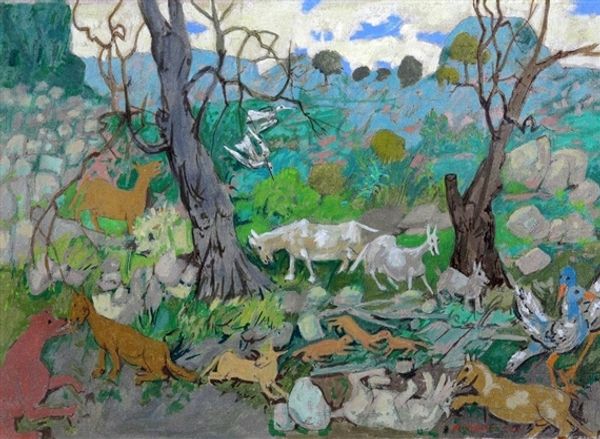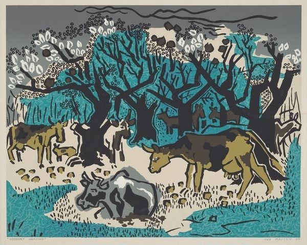 Curator: Jean Hugo's "Les trois chevaux," created in 1975. It appears to be watercolour. What is your initial reaction to the piece? Editor: Utter charm! It's so sweetly composed. A bit naive, almost like looking at a childhood dream of a countryside scene, all rounded hills and placid creatures. The colours are joyful! Curator: It certainly evokes a bucolic idealism. The brushstrokes, especially in the trees and the lilac sky, seem quite deliberate and repetitive. It's not just about capturing a scene; there's an element of pattern-making, wouldn't you agree? Editor: Absolutely, there’s a definite rhythm to the brushwork, almost musical. But you can see, too, how those repeated dots and strokes could reference labor, the very physical act of applying the paint, layering colour to slowly make that landscape take shape. Curator: Interesting. Considering Hugo's lineage – being the great-grandson of Victor Hugo – and his engagement with various artistic movements throughout his life, how might his privileged background influenced his artistic choices, his freedom to, perhaps, explore such simplified forms without concern for market expectations? Editor: That's a great point. Perhaps the privileged background gave Hugo the freedom to indulge a childlike, innocent vision. One where cows stand among horses as equals, watched over by cheerful blobs of bushes in each corner! The lack of perspective, that deliberate flatness, feels… generous. He gives us simplicity in its most pleasant form. Curator: Do you feel like the "naive art" is the right description for this piece, or do you think it carries more nuance because of Hugo’s training and history? Editor: You're right to point that out; I think it’s walking a fascinating line. He knowingly simplifies, which is different from truly naïve creation, the self-taught rawness that art historians adore. This work certainly dances with the spirit of naivety, but there’s an elegance that peeks through all the simplicity. Curator: On reflection, analyzing the intersection of artistic labor, idyllic simplicity, and familial privilege gives me much to consider within the artwork's context. Thank you for your thoughts. Editor: Likewise! Hugo's little scene opened a wider horizon, proving it’s full of life.
