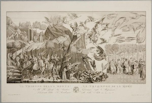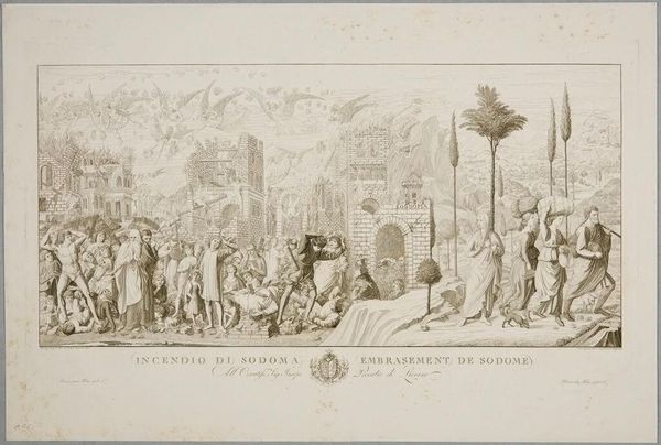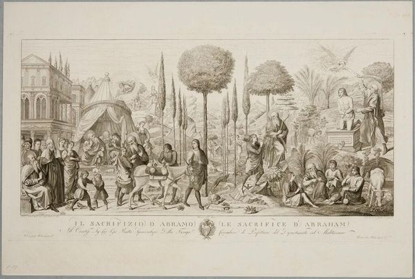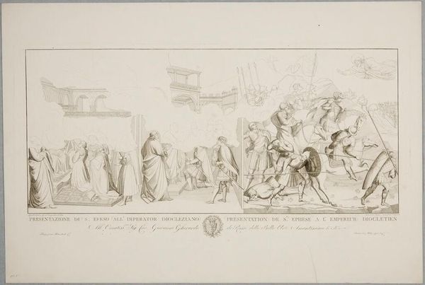 Curator: Looking at this print titled "Miracles of the Dead Ranieri," created by Conte Carlo Lasinio, what comes to mind? Editor: The first impression is like a faded dream, a collection of moments barely held together. It feels distant, ethereal, almost… ghost-like. Curator: This work depicts several miracles attributed to Saint Ranieri, each vignette showcasing his posthumous influence. The scenes are very deliberately arranged, consider the placement of the figures. Editor: True, it's less about individual stories and more about the cumulative effect – the sheer volume of Ranieri's presence even after death. The composition guides the eye, like reading a story. Curator: Saint Ranieri is a local saint, a patron figure. The artist chose a visual language that’s both commemorative and subtly instructional. Editor: It's like a faded fresco brought back to life in monochrome. It captures a sense of history, filtered through someone else's memories. A poignant reminder that even saints become echoes over time.