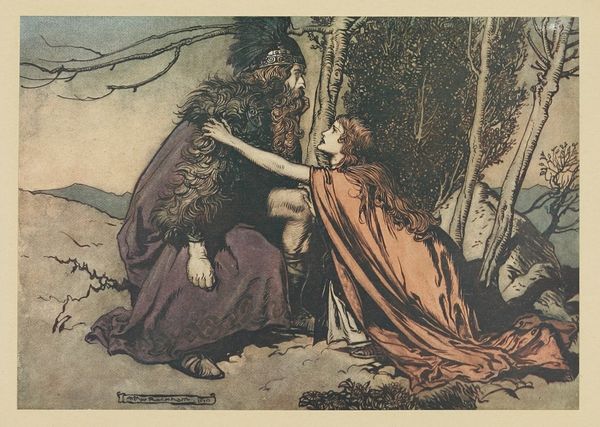 Arthur Rackham made this illustration of Little Red Riding Hood, sometime around 1902, probably with ink and watercolor. I’m really drawn to the way he uses color – it's almost like he's not afraid to let the colors bleed and blend together, creating a sense of depth and texture that feels really alive. Look at the way he renders the wolf's fur, using these tiny, scratchy lines. You can almost feel the texture of the fur, it's kind of unsettling. But then, look at the way he paints Red Riding Hood's cloak. The red is so vibrant, almost luminous. It's like a beacon of innocence in this dark, creepy space. Rackham’s work reminds me a bit of Paula Rego, particularly in the way she reimagines traditional fairy tales with a darker, more psychological edge. But Rackham’s mark making feels so unique, it's as if he's inviting us to get lost in the details, to find our own way through the story. It really underscores the idea that art is always an ongoing dialogue, a process of reinterpretation and reinvention.