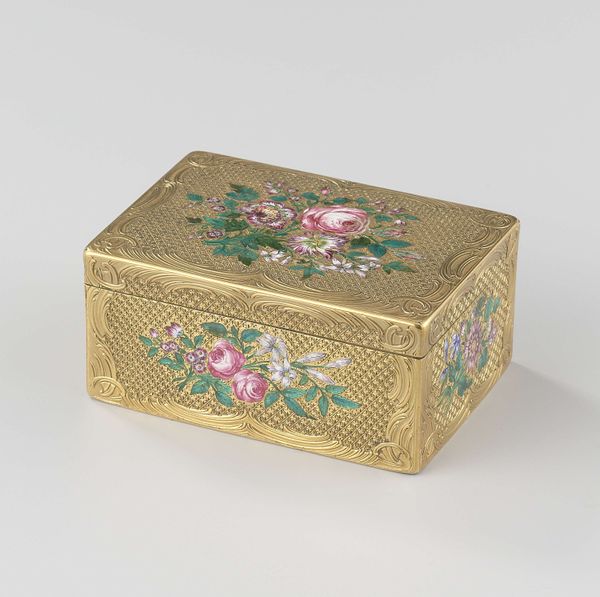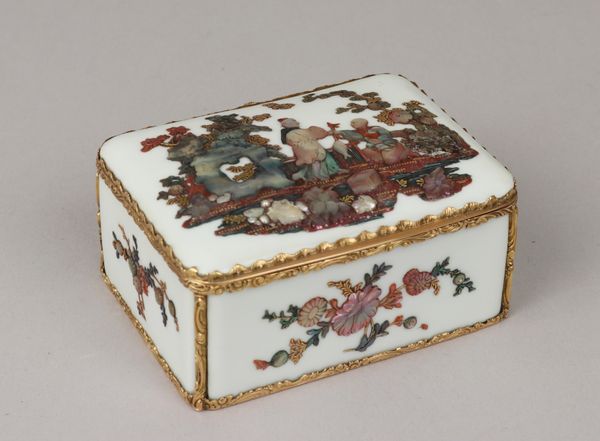Curator: Oh, my goodness, this Snuffbox just vibrates with light. It feels as though all the secrets whispered over snuff have sunk into its very being. Editor: Well, indeed. Crafted between 1751 and 1752 by Jean-François Garand, this little rococo treasure here at the Metropolitan Museum, epitomizes luxury and speaks volumes about 18th-century social rituals and material production. It's made of ceramic and is heavily gilded, reflecting status through consumption. Curator: I adore that you immediately went to consumption, because it IS indulgent, isn't it? All that delicate, painterly floral decoration on what is, after all, a box for *snuff.* What emotions were swirling as those tiny flowers were added? What was the artisan thinking about, in that quiet intensity? Editor: My attention goes directly to the amount of labor involved in creating something so ornamented from what basically started as humble clay. Every decorative element represents hours of labor, from the initial modeling and firing to the meticulously applied gilding. This wasn't just an object; it was a product of complex socio-economic systems that linked ceramic workshops, guilds, and aristocratic consumers. Curator: So much gilding; what must that labor have felt like for the artist's fingers? Is there pride, exhaustion, or even a sense of becoming as ornamented as the piece itself? I wonder if they imagined their touch persisting across the centuries? It does have a feeling of the artist lingering. Editor: The materiality tells such an interesting story of trade networks and economic power—the guilds would be so meticulously crafting things to be traded all over the world. Considering that, even this beautiful snuff box can be considered both high art and the product of global commerce. Curator: It gives me an almost visceral reaction to the hands that once held it. What do you feel you now understand differently, having really explored it again like this? Editor: Its opulence highlights the stark social inequalities of its time. And you? Curator: Well, now when I look at it, I'll remember it represents stories: the consumers and also, of course, the craftspeople, and now our own.