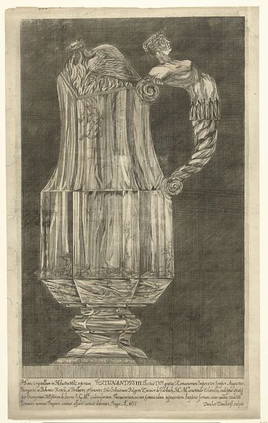 P. Bouland created this print, “Vaas met fenix,” depicting a vase which was made out of crystal found in Switzerland in 1682, and crafted in 1855 in Prague. The print illustrates an era where craftsmanship and natural resources were highly valued, and where the display of such objects signified wealth and power. Consider the socio-political dynamics of 19th-century Europe as we consider this work. The vase, a symbol of luxury, connects to the identities of both the artisan who meticulously shaped it and the elite who possessed it. Bouland’s print not only captures the vase's physical attributes but also its cultural significance, reflecting a society deeply stratified by class and status. The choice of a phoenix as the vase's ornament adds another layer, symbolizing rebirth and resilience, perhaps mirroring the historical upheavals and transformations of the time. This piece invites us to reflect on how objects become imbued with meaning.