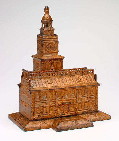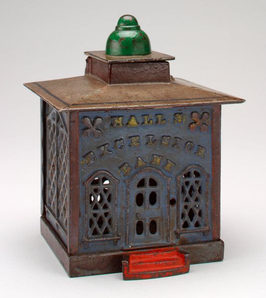 Curator: Well, that certainly has a peculiar charm. Is it meant to be… whimsical? Editor: Let’s delve into this curious artifact. This is the "-Cupola- mechanical bank" created around 1874, its maker is listed as Diedrich Diekmann. It's currently held in the collection of the Minneapolis Institute of Art. It seems to be crafted from cast iron, likely with some pigments applied for color. Curator: It has an unusual architecture, doesn't it? The tower element is clearly meant to suggest some sort of public building... Perhaps representative of aspirational social values? The imagery does have that Victorian Era feel to it... Editor: The symbol of the tower as a safe-haven is everpresent, don't you agree? Note that little man popping out under the cupola when the mechanism is activated by inserting a coin. Almost like magic! Saving money becomes this fascinating visual display. Curator: Do you think this piece romanticizes industry or entrepreneurship? A miniature capitalist temple perhaps? How did the target demographic of middle class families view the connection between the financial reward cycle in correlation to virtue? Editor: I see an intriguing paradox. The architectural symbolism conveys stability and establishment, yet the playful mechanism speaks to change and uncertainty. Maybe the child sees his little contribution making a big change and creating reward. I wonder, were they also exposed to these symbols within the architectural imagery of the buildings in the cities? Curator: Absolutely, these children saw symbols, in urban settings, every single day. These sort of savings tools normalized these symbols. If you saved you'd obtain rewards... you'd be like that strong stable tower. That makes the act of saving both enjoyable and instructional. I think this speaks to that societal desire to shape children's financial values. It almost plays like a microcosm of society itself, right? Editor: You've put your finger on its enduring resonance, this isn’t merely about pennies, it embodies this hope and promise of economic security from an earlier moment in our shared memory. A beautiful example of our ever evolving and complicated relationship to societal infrastructure and cultural wealth.