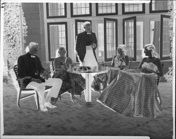 Robert Frank’s photograph "Actors near table--Filming", captures a moment of quiet tension in a domestic setting. The composition, rendered in stark monochrome, is divided by the figures of a man and a woman, each seemingly absorbed in their own world. The man, positioned to the left, stands rigidly with his hands clasped behind his head, a gesture that could suggest either anxiety or restraint. Frank's use of black and white photography strips away the superficial, focusing instead on the underlying structures of human interaction. The woman, leaning over a table laden with objects, further complicates the narrative. The scene’s arrangement feels deliberately staged, hinting at the artificiality of the performance. This staging draws attention to the broader themes that Frank explored in his work. His images often destabilize conventional notions of representation. The photograph isn't just a depiction of a scene but a commentary on performance, identity, and the constructed nature of reality.