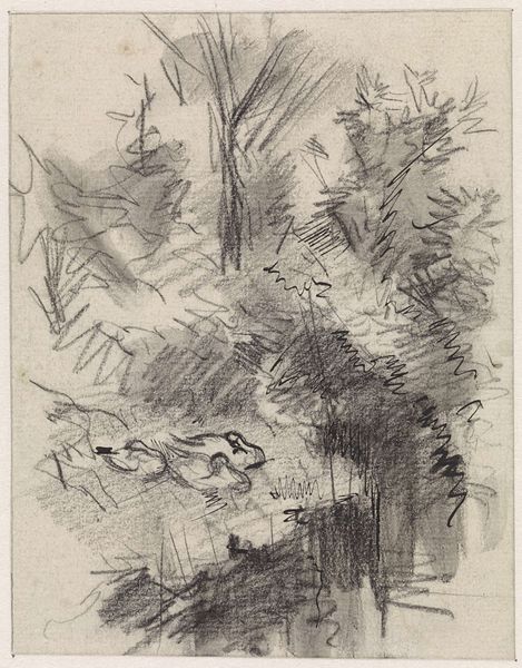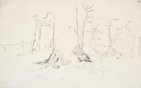 Editor: This is "Two Trees and a Pool with Aquatic Plants" by Joannes Bemme, dating from 1809 to 1841. It’s an ink drawing on paper, currently held at the Rijksmuseum. I find it very stark. What elements of composition stand out to you in this piece? Curator: The starkness arises primarily from the stark linearity within. The composition bifurcates horizontally into discrete registers of representation, that being trees over plants. Notice the upper register utilizes hatching to articulate the decay and density of the tree trunks. It begs a key question: is there some symbolism between decay and natural re-growth? Editor: That’s a very good point, a possible symbology of passing and rebirth, and is perhaps an appeal to a cycle within nature itself. Curator: Indeed, further, observe the linearity that constructs these discrete sections is replicated via the verticality of the aquatic plants. Line defines depth and directs the viewer's gaze. The reflections within the water offer a moment of duplicity – the implied depth and dimensionality offer an enticing element, don’t you agree? Editor: Absolutely, the mirroring adds to the implied depth but, also contrasts with the density you pointed out in the trunks of the trees. The hatching there definitely gives the image more "weight". Curator: Precisely. Consider also, the blank space – what function might it serve within the structure of the work? Editor: I suppose the blank areas draw even more attention to the detail included on other regions of the paper. I had not previously considered that, thank you. Curator: My pleasure. Paying attention to compositional elements like this drawing encourages a richer appreciation, don't you think? Editor: I certainly agree. Looking at the formal relationships has really changed how I see this drawing.