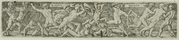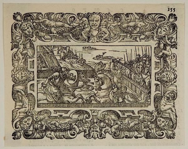 Curator: This is "Canto 6, p. 48," an intriguing anonymous artwork from the Harvard Art Museums. The scene is intense! It feels like a split second before impact, doesn't it? The air crackles with tension, even in this small print. Editor: The process really draws me in; likely an engraving given the fine lines. The labor involved in such detail is astounding. It really makes you think about who would consume art like this and how. Curator: The ornate border contrasts sharply with the combat scene. Perhaps a commentary on the brutal realities of war framed by the opulence of the elite? Editor: Or maybe a publisher attempting to elevate a mass-produced print through decorative addition. The materiality speaks to broader consumption patterns, wouldn't you agree? Curator: Perhaps, but I still feel a personal connection. The artist, whoever they were, poured so much energy into capturing this moment. Editor: Art production and consumption are never simple, are they? It really does leave you questioning the artist’s intent and the audience's response. Curator: Absolutely. It's a powerful image that keeps pulling you back in.