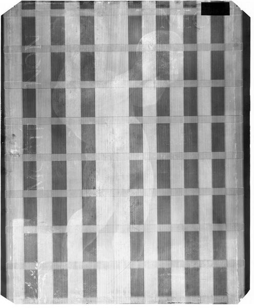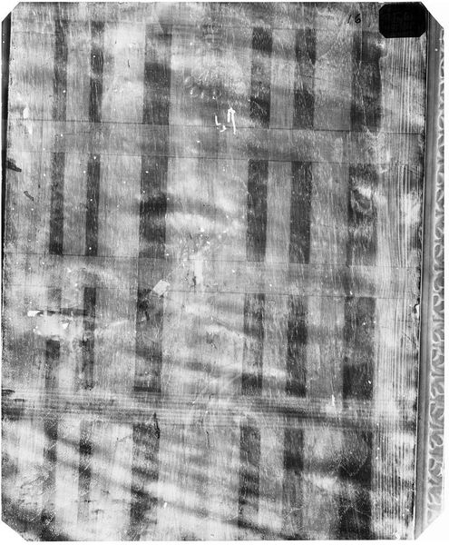 Editor: This is an x-radiograph of "Crucifixion" by Lorenzo Monaco, part of the Harvard Art Museums collection. It looks like a grid of dark and light rectangles. What does an x-ray reveal about the art and its history? Curator: X-radiography offers a behind-the-scenes look at the materials and methods used to create a painting. It allows us to understand the cultural values and institutional practices surrounding its creation, preservation and study. Editor: So, by analyzing the materials, we can learn more about the social context of the art? Curator: Precisely. Materials and techniques often reflect available resources, artistic training, and even the economic or political climate of the time. Think of it as a material record of the artist's world. Editor: That's a really interesting way to look at it. I never thought about the socio-political forces in the literal components of art. Curator: Indeed, and the X-ray also exposes the choices made by restorers throughout its lifespan, a physical record of institutional interventions that shape how we perceive the art today. Editor: I see. So, an x-ray becomes another layer in understanding the complex life of this piece!