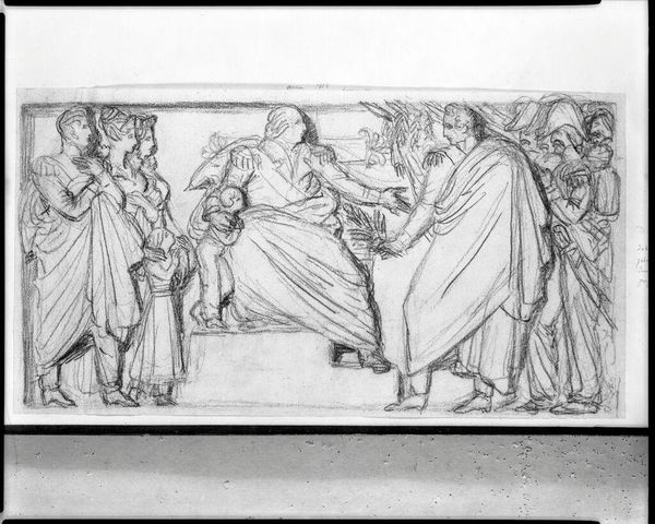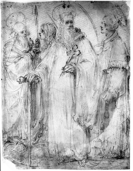 Editor: This drawing, "Figures Copied after Dürer's Woodcut, Four Winds, Apocalypse," by an anonymous artist, seems to capture a moment of intense drama. What stands out to you about this piece? Curator: Well, it's fascinating to consider this drawing not as a unique creation, but as a reproduction, an act of labor. How does copying Dürer, a master printmaker, impact the material value and social function of this work? Is it reverence, skill-building, or perhaps something else entirely? Editor: That's interesting. So, you are suggesting its value lies in its relation to the original and its production process? Curator: Precisely. Consider the socioeconomic implications: who had access to Dürer's prints? What kind of labor went into this copy, and who might have commissioned or consumed it? Editor: I hadn't thought about it that way. It makes me see the drawing less as an artwork and more as a product of its time. Thank you!