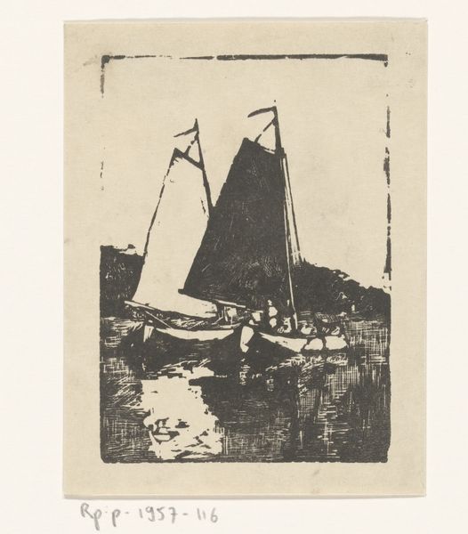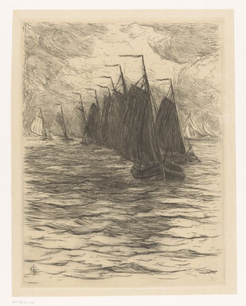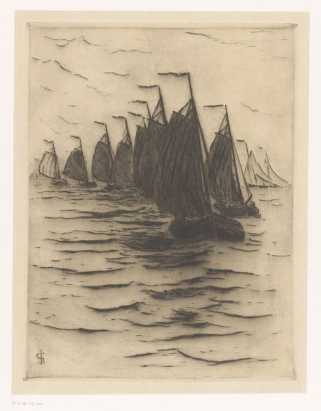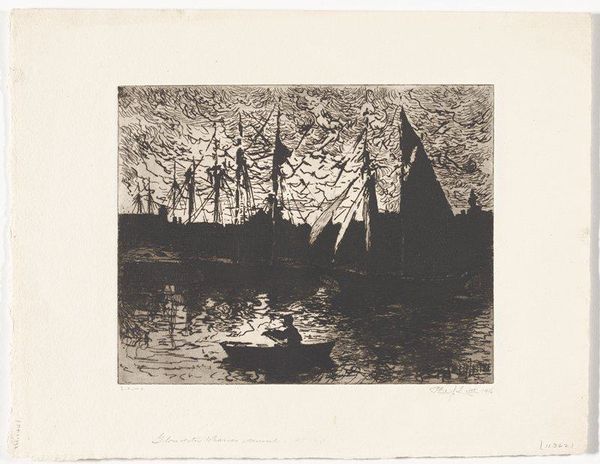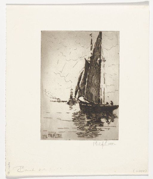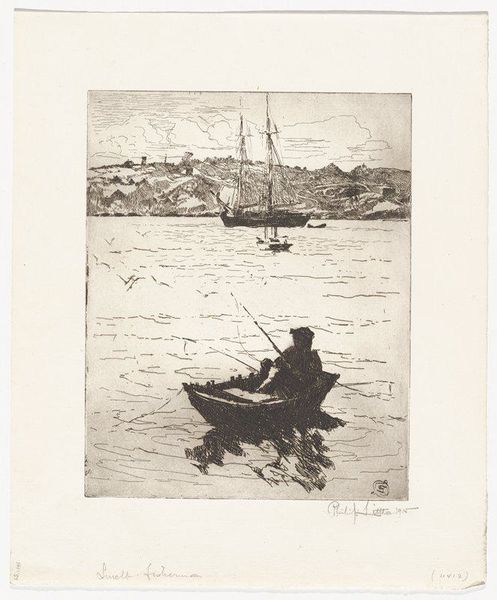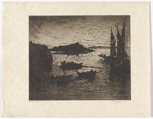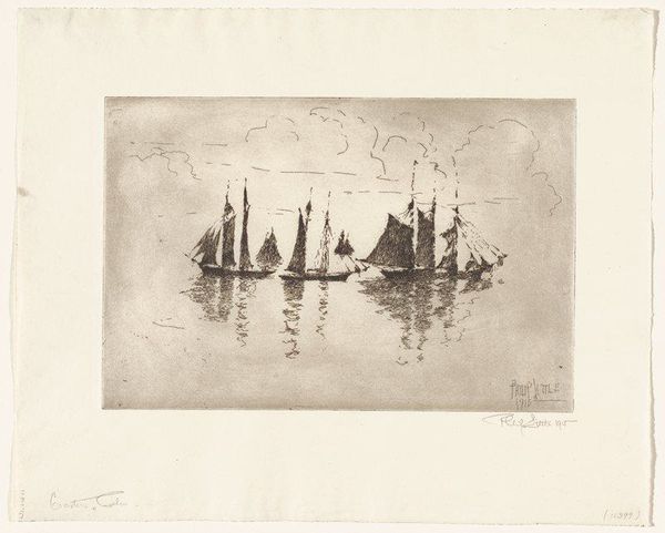 Curator: We’re standing in front of Philip Little's etching, "Fishermen - Morning," created in 1915. It resides here at the Minneapolis Institute of Art. Editor: Immediately, I’m struck by a feeling of anticipation, that pre-dawn stillness hanging heavy in the air before the fishermen begin their labor. Curator: Yes, the atmospheric quality is central. The print, done with delicate etching lines, conveys a scene where the tangible reality of boats and water blends with the promise of the morning sky. Consider the work involved. The image wasn't directly drawn; rather, the artist would have carefully and laboriously cut through a resistant ground covering the plate to produce such exquisite details. Editor: It does conjure a sense of tradition, these simple sailing vessels against a dramatic skyscape; almost a visual trope for "labor at sea." But there’s also the religious symbolism we see historically attached to fishermen. Is it a purely vocational image, or does it gesture toward something deeper? Curator: That’s interesting to consider. It makes you think about the fishermen’s relationship to nature, their reliance on both the material resources and the spiritual impact of their livelihood. Did they also view their daily haul with that lens? Were these laborers also living through a larger metaphor about man and nature? The repetitive acts, etching by etching, almost echo the daily toil of the fishermen. Editor: Right. The dark silhouette of the boat is echoed by shapes on the horizon; an almost mythical, perhaps hoped for, end to a hard day's labor. In that sky, it almost takes on the form of the 'leviathan' of myth. What’s fascinating to me is the way that, through repeated images like this, "the fisherman" becomes not just a job description but a carrier of cultural values like resilience and resourcefulness. Curator: The social and material context enriches it; knowing the piece was crafted through physical, almost meditative, processes and presented during a burgeoning age of industrial mechanization, there seems to be more resonance beyond what meets the eye. It prompts one to see even ordinary subjects in a new light. Editor: Indeed. These enduring visual metaphors, like that of the lone fishermen, tell us much about humanity, echoing far beyond that initial pull of the oars.