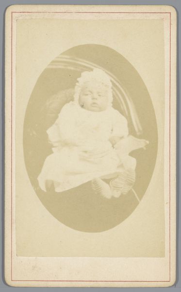 Editor: Here we have Victor Angerer's "Portret van een baby," a gelatin silver print, dating roughly from 1870 to 1910. It's so classically framed! I’m struck by the direct gaze of the baby. It's so serious and confident, and creates a rather formal, almost comical mood. What does this image say to you? Curator: That's a great observation. Studio portraiture of children in the late 19th century was heavily influenced by conventions of adult portraiture. The aim wasn't necessarily to capture the supposed innocence of childhood, but to present the child as a respectable member of society, reflecting on how notions of personhood were being shaped in rapidly industrializing societies. The image functioned, in a way, as a symbolic investment in the future. Do you think that's what's on display here? Editor: Possibly, though that baby's expression also reads as mildly annoyed! How does that affect the reading of this as aspirational? Curator: I find the slightly petulant expression really fascinating, precisely because it complicates that aspirational reading. The child is already expressing agency, even resistance, within these structures. The photo therefore also embodies the growing interest in capturing individual likeness. I wonder, who was this child to the artist, and why was its portrait deemed important to produce, preserve, and share? It must have meant something socially for the parents or guardian to have the child represented like this. Editor: This photo, then, captures social aspirations and individual expression in a fascinating tension! Thinking about the audience helps unlock the image for me. Curator: Yes! Considering how photography was consumed and circulated back then is crucial. It really illuminates how we understand individual identities and cultural values.