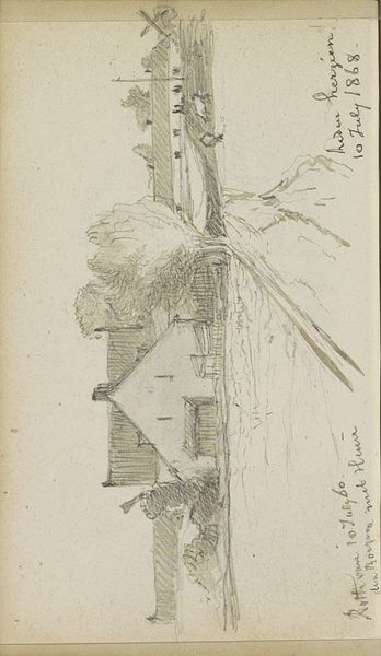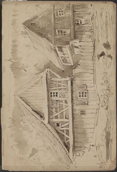 Johannes Tavenraat made this sketch of a half-timbered house with pen in brown ink and brush in gray ink. The strokes on the paper show a sense of quick, informal observation. The ink spreads slightly in certain areas, adding depth and volume to the architectural structure and surrounding foliage. The controlled nature of the drawing captures the essence of labor and social context. In the detailed rendering of the timber-framed construction, one can appreciate the traditional craftsmanship involved in building such a structure. The half-timbered house reflects a specific mode of construction, deeply rooted in regional building practices and local materials. The presence of figures and ducks introduces an element of everyday life, depicting a scene of domesticity within this architectural setting. Through his meticulous process and attention to detail, Tavenraat elevates the sketch into a study of material culture, blending fine art with elements of craft.