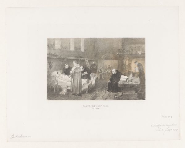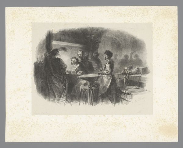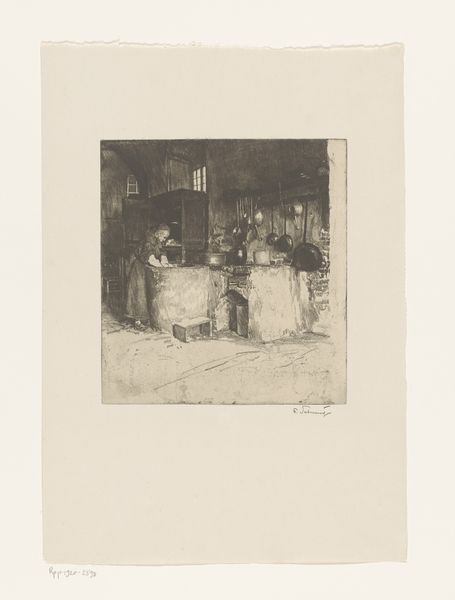 This is Alexandre Lunois's 'Visitekaartje van prenthandelaar Edmond Sagot te Parijs', a print offering a glimpse into the world of Parisian art dealing. The soft hues and textured surface immediately draw you in, suggesting a scene of quiet contemplation and aesthetic appreciation. On the left, the inscription acts as a sign, denoting the art dealer’s name and the modern prints he offers. The composition is balanced by two figures, each seemingly absorbed in the examination of artwork displayed on an easel. The formal arrangement implies a narrative structure, positioning us as observers of a private transaction. Lunois uses colour and line to create a sense of depth, which plays with traditional perspective. The background, a mere shadow, contrasts with the detailed foreground. In this context, the print not only advertises Sagot’s business, but also positions art dealing as an intimate and cultivated experience. Ultimately, the work functions as a site where commerce and art appreciation converge.