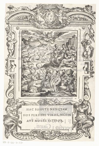 Curator: Immediately, what strikes me is the dynamism captured in what is, ostensibly, a monochromatic print. There's so much movement implied. Editor: I agree. There's this kind of organized chaos, like a swirling vortex of scholarship and putti! Let’s unpack this; the engraving, made in 1643, is titled *Allegorie met Geschiedenis, Geleerdheid en Waarheid* – which translates to *Allegory with History, Scholarship, and Truth*. It’s by Theodor van Merlen. Curator: And how meticulously van Merlen utilizes the Baroque style! The composition draws the eye upwards. Note how the central text, emblazoned on what looks like a draped banner, is framed by allegorical figures representing erudition and truth. It almost appears as if it emerges from darkness into divine illumination. Editor: Totally. The central text promotes the Acta Sanctorum – "Acts of the Saints" – and references Ioannes Bollandvs and Godefridvs Henschenivs who are named as Jesuit theologians whose scriptural study underpins their work, suggesting it unveils something long obscured. It seems heavy duty! Curator: The details are important. The hourglass next to the figure of Veritas is particularly striking. An hourglass denotes Time – and so implies something beyond it. Moreover, Eruditio directs to the importance of old erudition or sources. Both underpin that this allegory not only speaks of truth and learning, but that Truth, is revealed through the relentless examination of historical sources. Editor: Look, the figures have this luminescence – not really highlighting any darkness in this. So I wonder… were they trying to portray truth and historical insight as undeniably uplifting? Like, a break from the shadows, into enlightenment? It’s Baroque so sure, intense – but intensely optimistic, somehow. Curator: The chiaroscuro is cleverly used. Light doesn't only illuminate, but suggests hidden dimensions, and therefore it is inviting inquiry – a fundamental process towards the unveiling of what is true and veritas, afterall. So, while optimism can definitely be extracted, I can also feel the density, the demand, and intensity of intellectual labour. Editor: Good point. It makes one reflect on where you place your own "truths." The "Acts of the Saints," in the artist’s vision, isn’t passive, it’s energetic – which for 1643… it must've felt kind of revolutionary? Curator: Precisely! We started talking about movement. Van Merlen presents learning not as a destination, but as an animated quest! Editor: Beautiful. Let's dive into another work!