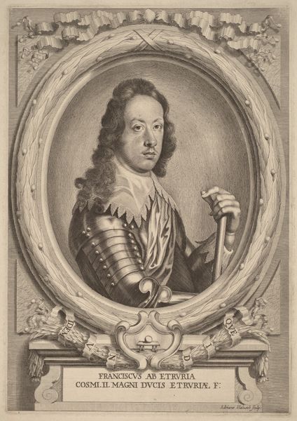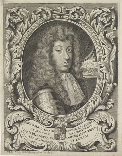 Editor: This is a print of Christian V from 1683, by Louis de Chomond Boudan, housed here at the SMK. It's a very formal portrait, surrounded by ornate details, and at first glance, it seems to embody a strong sense of power and authority. What do you see in this piece beyond the initial impression? Curator: Beyond power and authority, I see a reflection of the complex social and political dynamics of the late 17th century. Consider the context: Christian V ruled during a period of significant social stratification and colonial expansion. The lavish details, like the armour and the elaborate frame, speak to the constructed nature of royal identity and the visual language of dominance. This image was designed to broadcast authority, but what power dynamics were truly at play? Who was excluded from this picture? Editor: That’s interesting. I hadn’t thought about it in terms of who is absent. So, how does this portrait function within those societal structures? Curator: It acts as a form of propaganda, legitimizing Christian V’s rule. The inscription and imagery associated with him emphasizes piety and justice which aims to reinforce the idea of divinely ordained authority but it can also highlight what the artist omits to be critical about the King and monarchy in general. Who actually benefitted from the "justice" the image promotes? Considering whose voices aren’t amplified here is crucial to unraveling its underlying message. Can you notice those subtle visual clues? Editor: Now that you mention it, the inscription and coat of arms seem strategically placed to underscore the King’s virtues and lineage, reinforcing a specific narrative of leadership and righteousness. What are you thoughts? Curator: Precisely. And in that constructed narrative lies a key point for contemporary viewers: recognizing how portraits such as this actively shaped and perpetuated unequal power structures. They are powerful visual testaments and also tools to keep specific parties underrepresented in a time of oppression. Editor: I'm starting to see how unpacking the layers of history and social context really changes the way you understand a seemingly straightforward portrait. Thanks! Curator: It’s all about understanding the image not just as a representation, but as an active participant in historical power dynamics. Now you can explore similar things within our contemporary time.