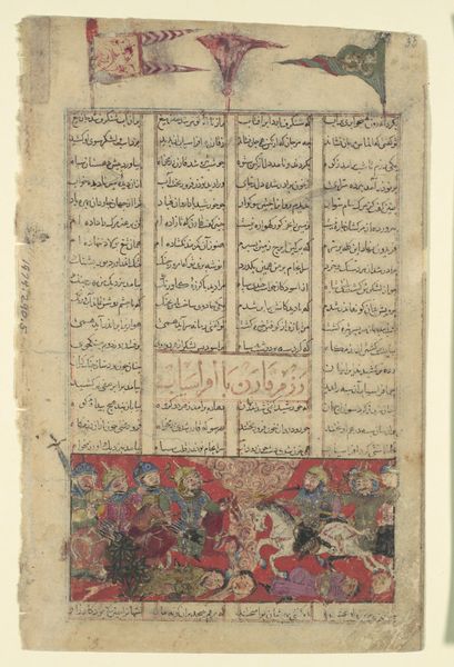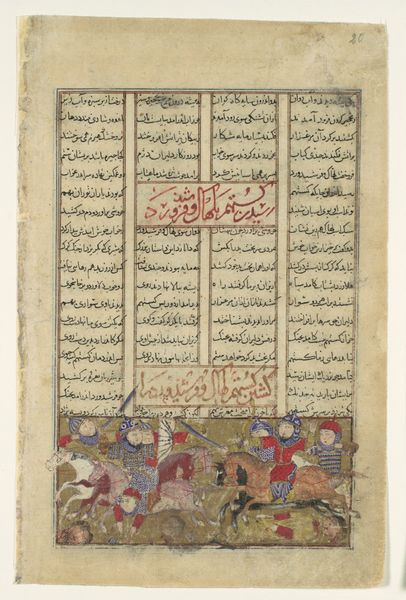 Curator: We’re standing before “Khusrau and Shirin Conversing in Landscape at Night,” a folio plucked from a Khamsa, or Quintet, of Nizami of Ganja, created sometime between 1600 and 1655. It’s a painting, a miniature really, done with ink and what looks like colored pencil on paper. Editor: Oh, wow, it feels like eavesdropping on a dream. There's this gentle, floating quality. Are those canopies hanging mid-air? They feel both grounded and completely untethered at the same time. Curator: Exactly. The artist paints a moment of intimacy, depicting the legendary lovers Khusrau and Shirin engaged in conversation. Placed underneath lines of text from the tale, the image uses elevated platforms to show them in their landscape. It really highlights the narrative art style prominent in Islamic art. Editor: The figures themselves are quite stylized. Their expressions, or lack thereof, pull me in. I’m wondering what’s going unsaid. You know, that almost stifled feeling of a conversation pregnant with possibility… There’s this gorgeous jewel-toned palette; gold, reds, blues, greens. Curator: And this is quintessential Orientalism. Note the detailed costumes, the idealized setting… It paints an enchanting image of the East filtered through a distinctly Western lens. It evokes the romanticism so popular in that era. The figures almost look like porcelain dolls, carefully posed within a theatrical tableau. Editor: The tension between reality and artifice is potent. What seems almost cloying and overly sweet, becomes subtly disturbing. This imagined intimacy teeters on the brink of artificiality, perhaps reflecting a more profound observation on love, longing, or political theater… Curator: Ultimately, it is a testament to the enduring power of Nizami's tale and the artistry used to elevate that story to life in a painting now hanging far from its creation. Editor: I am reminded that these small snapshots of conversations or encounters echo down through time to reveal how the story continues to hold truths to those that allow the work to open the channels within to the moment itself.