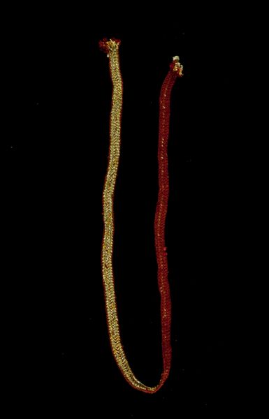 This undated headband, created by an anonymous artist, is held at the Minneapolis Institute of Art. The textile work features a muted palette of cream and red. The composition guides our eye along its slender form and intricate patterns. The headband employs a sophisticated semiotic system. The cream base, contrasted by the red linear designs, creates visual interest. These designs, though abstract, hint at symbolic elements, perhaps cultural markers embedded within the community that produced it. The choice of materials also speaks volumes. Textiles, often associated with the domestic and the feminine, were historically excluded from the high art canon. This headband, through its delicate craftsmanship, destabilizes these established hierarchies. Note how the artist repeats certain motifs along the length of the band. This repetition underscores the idea of continuity and tradition. The very form of the headband, designed to encircle and adorn the head, suggests ideas of status and identity. The headband functions not just as a decorative object but as a complex carrier of cultural and philosophical ideas.