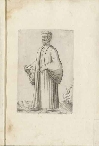 This is an engraving of a Hieronymite Monk, made by an anonymous artist. The composition emphasizes the monk's figure, cloaked and head bowed over a book, it occupies nearly the entire frame. The use of hatching and cross-hatching creates a sense of depth and volume, particularly in the folds of the monk's habit, while subtle tonal gradations suggest the play of light. The vertical lines of the habit contrast with the horizontal lines of the book, creating a visual tension that holds the viewer's gaze. The blank space around the figure isolates the monk, underscoring his contemplative stance. The overall effect is one of quiet introspection. It captures a moment of private devotion. The artist's formal choices invite the viewer to contemplate the relationship between the individual and the divine.