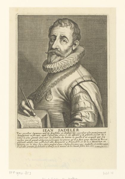 Curator: This portrait before us, dating somewhere between 1600 and 1688, is titled "Portrait of Claude de Marolles." The piece resides here at The Met. It’s attributed to Claude Mellan. Editor: My first impression is how meticulously crafted this portrait appears, all those fine lines making up texture and form, giving an almost tangible feel to his ruff and armor. The monochrome heightens the intensity. Curator: Mellan, known for his unique engraving technique, demonstrates that skill beautifully here. It reflects the political and religious turbulence of the period. Marolles was clearly a figure of importance, likely involved in the religious conflicts ravaging France. Editor: Right, and the means by which it's made—the precise, deliberate act of engraving—becomes integral. You think about the labor, the sheer dedication, and how it elevates the status of both the sitter and the artist. The engraving is the craft, really. Curator: Indeed. Consider also the social function of such a portrait. It solidified Marolles’ status. Displayed perhaps in his home, in a public space, or reproduced as prints, it constantly reinforced his authority and virtues. Editor: The uniform tells its own story, doesn’t it? Not just an indication of status, but material – metal, cloth, crafted with significant skill, made to project an image of strength and command. The materials and their making speak volumes about early modern society. Curator: The Baroque period valued drama and elaborate detail as strategies of persuasion. These portraits served less as documents of reality, and more as ideological pronouncements of class, family, and faith. Mellan has delivered it very well in the likeness of de Marolles. Editor: It's not simply about capturing his appearance. It's about the politics of representation through material things, like his armour which displays power and the delicate skill needed to show status through printing, with social complexities reflected in those very lines etched into the plate. Curator: This really gives a new perspective on this Baroque portrait! Editor: Yes, it seems we both agree that there's more to this engraving than meets the eye, and a deeper story woven within its details and production, highlighting its power.
