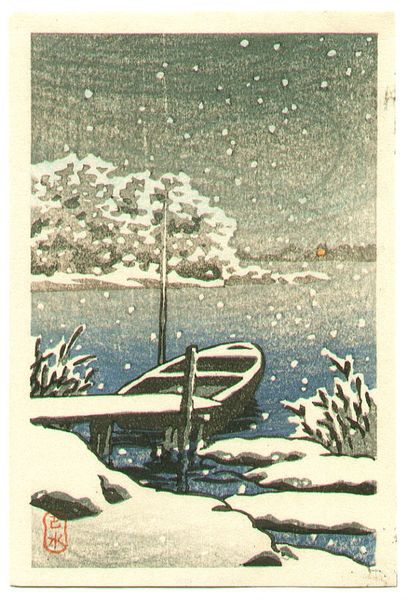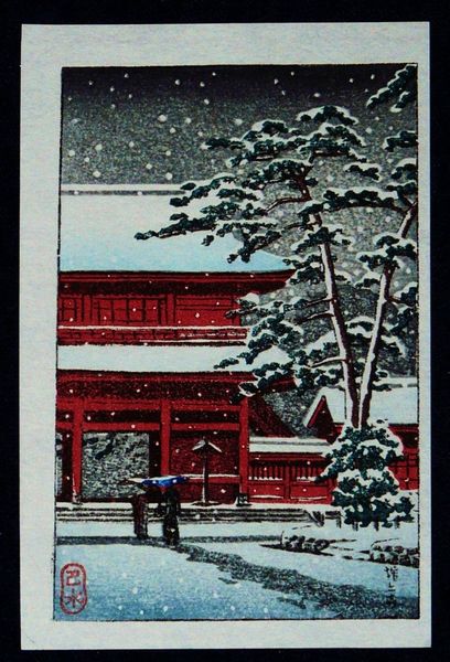 Curator: Immediately I’m transported. It's a scene both hushed and magical. What are your first impressions? Editor: There’s a strong feeling of serenity here. You can almost hear the muffled sounds of the snowfall, the soft crunch of snow underfoot. It reminds me of that fleeting stillness just before a big societal shift. Curator: That's an interesting point of view! We're looking at "Ikegami Honmonji Temple," a woodblock print by Hasui Kawase created in 1931. He really captures a sense of time standing still, doesn't he? Editor: Absolutely. And if you examine the historical moment in Japan at that time, you have an increasing nationalism intertwined with the effects of economic depression—an unsettling quiet before a storm. Are those women visiting the shrine despite the harsh weather, or just hurrying home to escape it? What would they be praying for in that moment, I wonder? Curator: Such insightful questions! Kawase’s use of the snowy landscape—that gorgeous, snow-laden tree dominating the foreground—lends an air of gentle melancholy, no? Almost like nature mirroring our own fleeting existence. Editor: Or perhaps a resilient natural world enduring despite human turmoil. These ukiyo-e prints were, in their time, affordable mass-produced items, glimpses into a supposedly unchanging, traditional Japan, consciously offered during a period of radical transformation, promising some sort of nostalgic, aesthetic reassurance. Curator: Nostalgia certainly resonates. And speaking of aesthetics, the artistic construction of this image is very conscious. He’s framing the women—the general population, so to speak—in this space that’s hemmed in by walls, and directed towards a vanishing point in the distance. It suggests that individual paths may exist, but perhaps the range of motion is limited. What do you make of that symbolism? Editor: Kawase’s image becomes less about reflecting some kind of "pure" Japanese culture, and more about crafting it for a specific purpose and audience at a turning point. How interesting is it to then have those gorgeous, jewel-like color gradations, making this potentially unsettling image so lovely! Curator: It is fascinating how those gentle color palettes make you linger even as the composition hints at tension! Well, it appears we’re out of time for today. Any final thoughts before we move on? Editor: This print feels like a powerful reminder that art, even when seemingly focused on beauty or tradition, often holds deeper, sometimes conflicting layers of meaning, if only we take the time to see it in context.