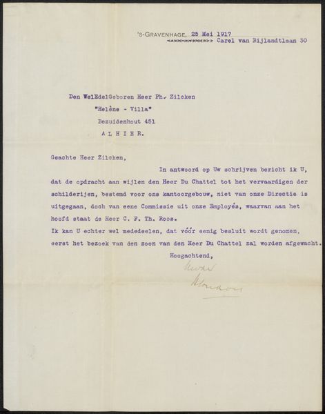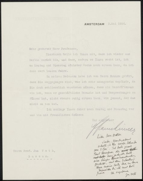 Curator: This piece is "Brief aan Philip Zilcken," created before 1918, artist is unknown, residing in the Rijksmuseum. It's an ink drawing on paper. Editor: It’s a letter. What stands out to me is its formality. It appears to be a typewritten page, dense with text, invoking a sense of historical gravity. What do you see in this piece, looking at it through your particular lens? Curator: Intriguing! Formally, let's consider the contrasting elements. The ordered rows of text are juxtaposed with the irregular application of the ink itself, particularly noticeable in the varied density of the characters, suggesting an interesting relationship between mechanization and the individual touch. Note also the centering of ‘Amsterdam, December 1918’ and the salutation; the paper functions as an unacknowledged geometrical canvas upon which these concrete forms have been placed. This arrangement subtly foregrounds the performative aspect of the text. The writing aims to appear formal, but how else does it affect its affect? Editor: So, the layout and presentation become part of the message itself. It emphasizes order, and perhaps even… authority? The very act of putting ink to paper in such a deliberate way suggests an importance that transcends the literal words. It almost reminds me of Concrete poetry. Curator: Precisely. Though not poetry, it shares a self-conscious awareness of visual language. Consider the materiality further: the texture of the paper itself and the precise viscosity of the ink. Ask how those textural, physical properties contribute to its aura. Are we truly absorbing its historical intention through careful attention to those qualities? Editor: It's fascinating how seemingly simple materials, ink and paper, and a uniform method like typewriting, can still carry such weight and layered meanings when you start to look at them more closely! I’ll definitely keep that in mind.