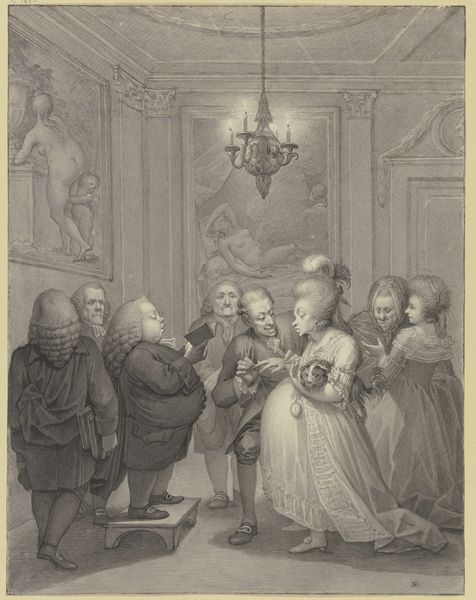 Curator: This engraving, dating from 1825 to 1840, by William Chevalier captures a poignant moment: "King Richard and Queen Isabel (Shakespeare, King Richard II, Act 5, Scene 1)." Editor: Gosh, what a farewell scene! The body language alone screams heartbreak. All that hatching creates a claustrophobic atmosphere too, as though history is bearing down on them. Curator: Indeed. Chevalier, working within a Romantic sensibility, pulls out the historical narrative elements inherent to Shakespearean drama. Consider how an engraving reproduces art: multiple identical copies can be circulated, bringing historical drama and idealized figures to the masses. This is not just about art; it is a carefully disseminated and accessible object. Editor: Accessible maybe, but deeply melancholic! Look at the Queen's embrace—it's as if she's trying to merge with him, to prevent the inevitable. And the armed guards in the background…grim harbingers of his doom. One can feel their cold metal, that steely, unavoidable end drawing closer. Curator: Yes, the steel and the page upon which it's rendered share material properties, as a consequence of similar extraction methods from the Earth. Note how that sense of imminent downfall is reinforced by the detailed rendering of their costumes and surroundings. Every fold, every line, every feathered cap signals the weight of history and societal expectations on these figures. The material conditions shape what is signified. Editor: Absolutely. Though knowing the scene gives an advantage. Still, there’s a power here beyond the text. It gets the feels churning! The print medium serves this narrative of doom and the feeling seeps into every line. I like to imagine how that would be staged theatrically to fully embody the art! Curator: It is precisely the relationship between the material form, an engraving meant for broad consumption, and its emotional resonance which I find most striking in this piece. The Romantic artists sought not merely to represent, but to move, using reproducible methods. Editor: Well, it got me. Maybe I should binge watch Shakespeare soon? Curator: Always an enriching experience.